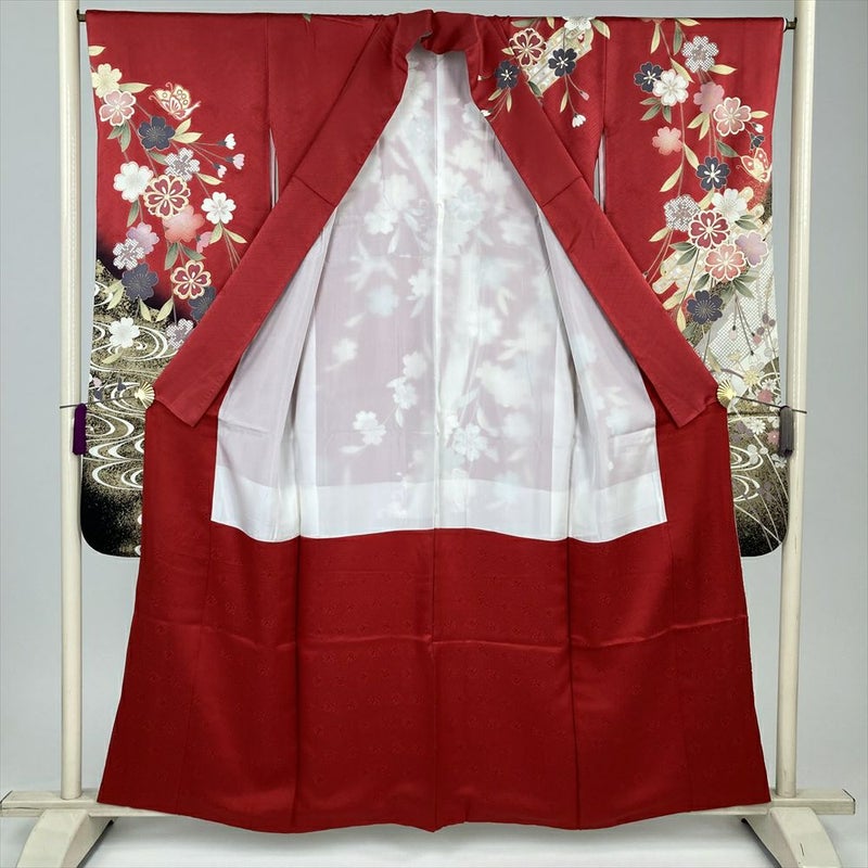 (中古) 振袖 ローズレッド 赤 フォーマル 花筏 袷 絹【身丈】154cm【裄丈】65.5cm