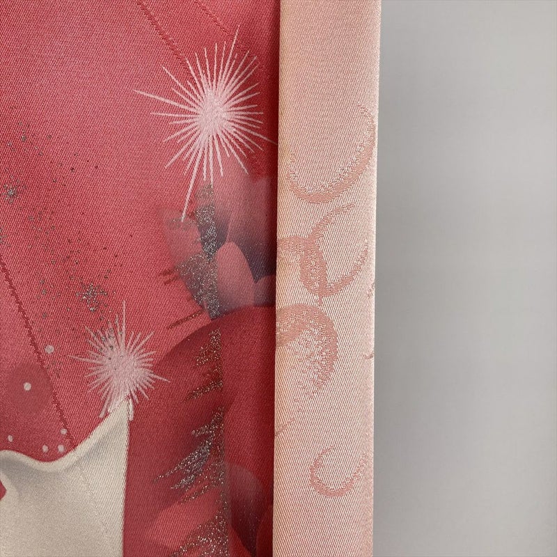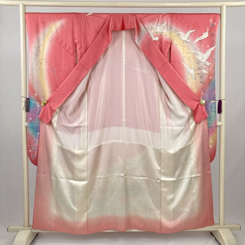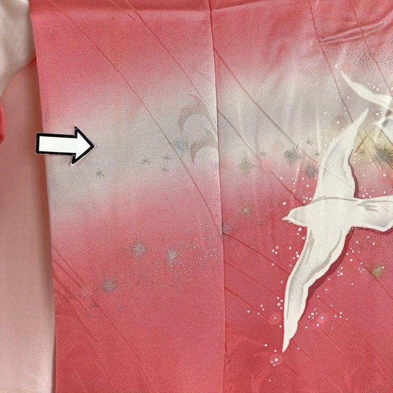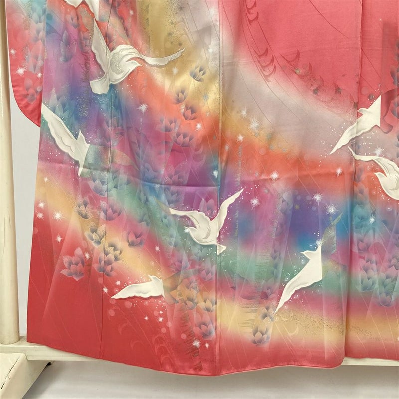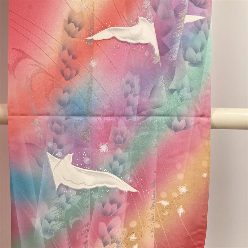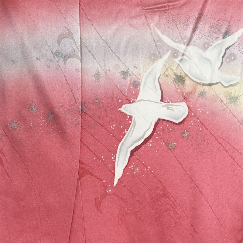 (中古) 振袖 ピンク フォーマル 白い鳥 メルヘン 虹色 ラメ 袷 絹【身丈】153.5cm【裄丈】67cm