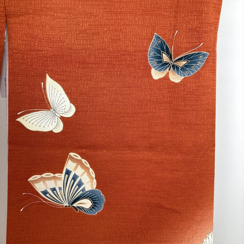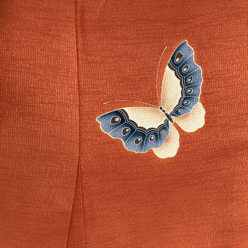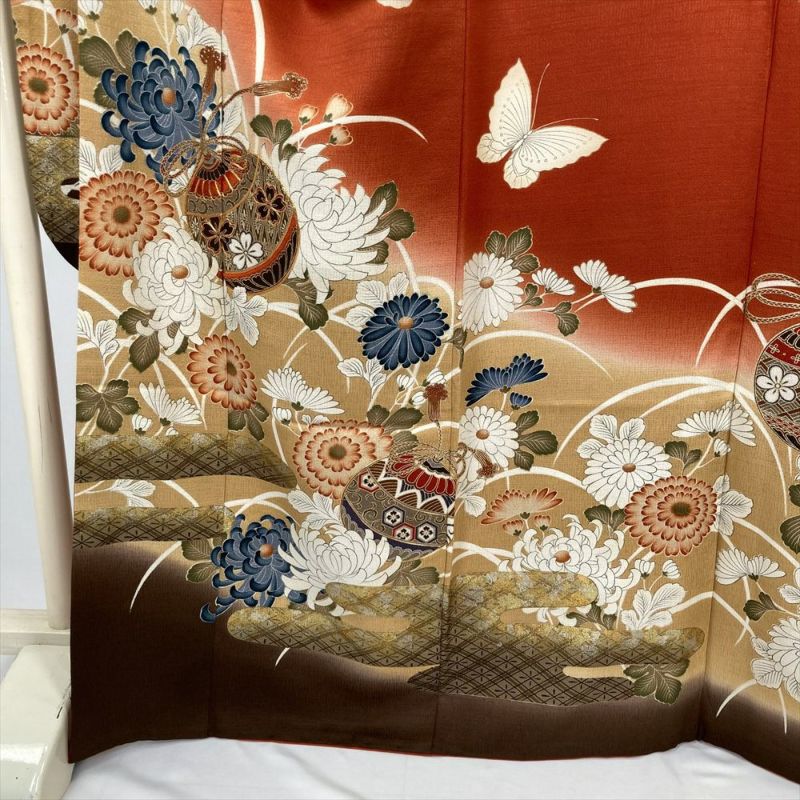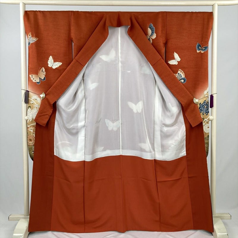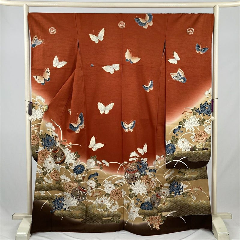 (中古) 振袖 赤茶 オレンジ フォーマル 蝶 鈴 菊 エ霞 袷 絹【身丈】163cm【裄丈】70cm