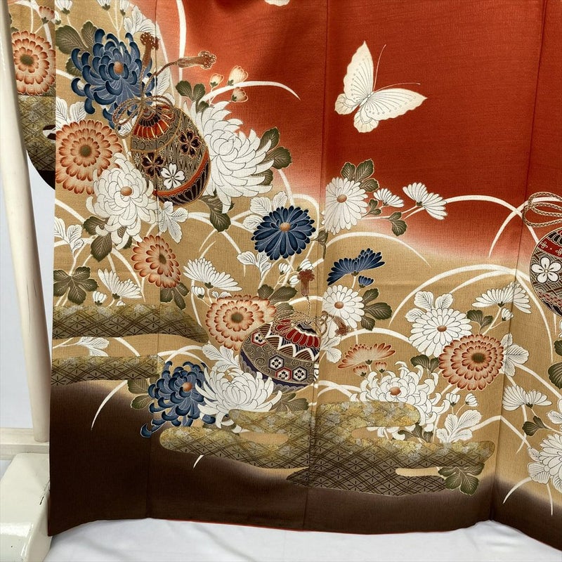 <div class=赤茶色の地に、鈴・菊・蝶の文様が染めと刺繍で丁寧に施された、雅な古典振袖。