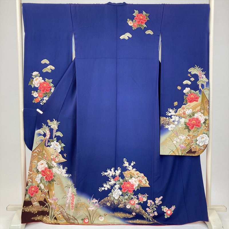 (中古) 振袖 紺 フォーマル 四季花 熨斗 宝尽くし 袷 絹 【身丈】164cm【裄丈】69.5cm
