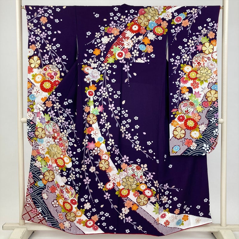 (中古) 振袖 濃紫 フォーマル 手鞠 桜 四季花 金駒刺繡 袷 絹【身丈】151.5cm【裄丈】64.5cm