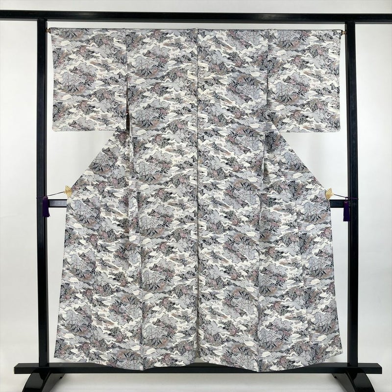 (中古) 単衣小紋 生成り色 薄灰色 グレー カジュアル ちりめん 雲上の景色 館 樹木 ひとえ SS【身丈】149cm【裄丈】66.5cm