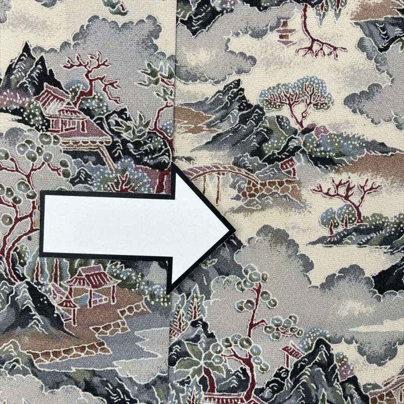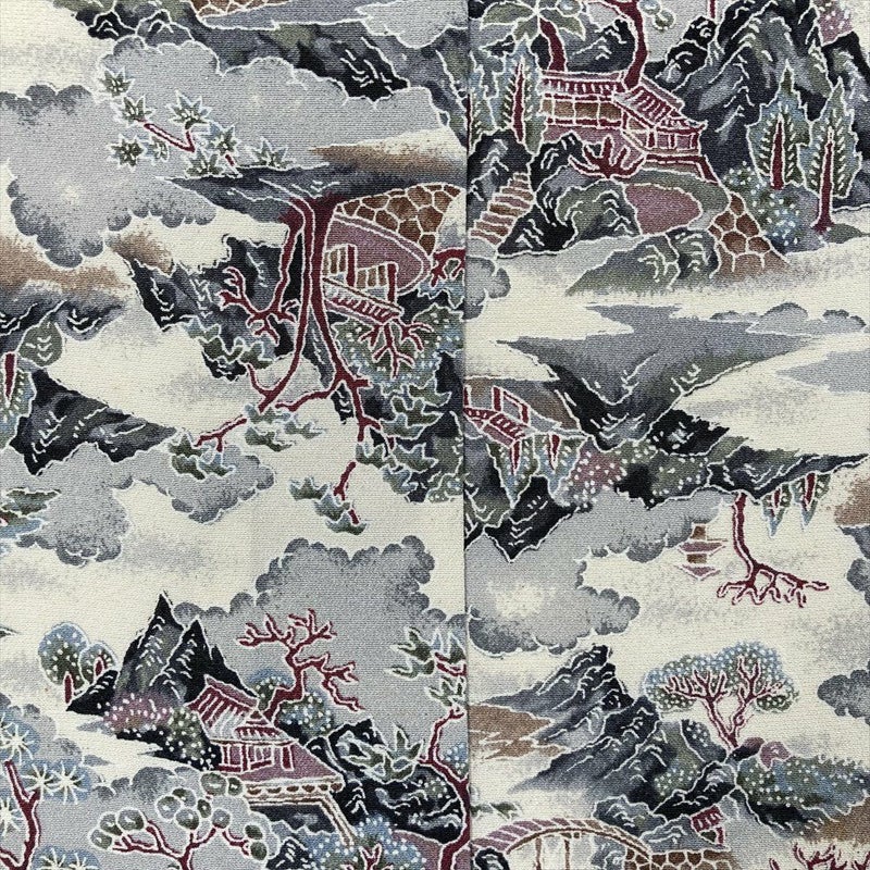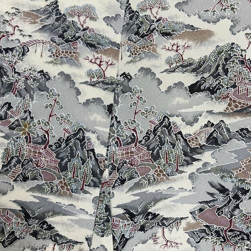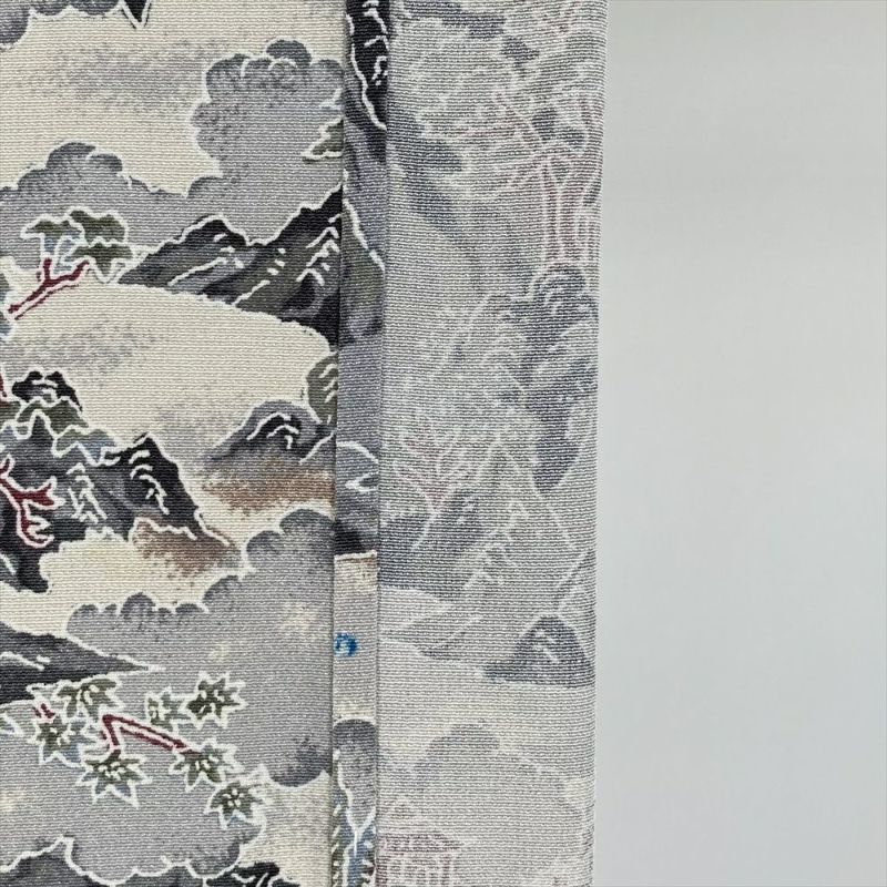 【色柄】生成り色 薄灰色 グレー カジュアル ちりめん 雲上の景色 館 樹木