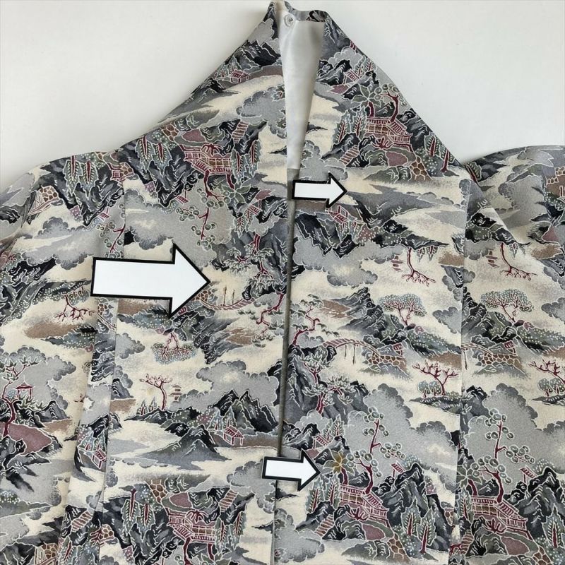 単衣の着物は裏地がついていません、袷の着物よりも軽く、風通しが良いのが特徴です。 袷ほど着る期間は長くないですが、春に急に気温が上がったときや、まだ暑さの残っている秋口に活躍します。現在は、温暖化のため単衣を長い期間(2ヶ月~5ヶ月未満)着用する人が増えてきました。衿、上前、下前に汚れがございます。保存臭がややございます。