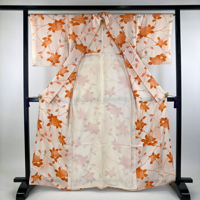 単衣の着物には裏地がついていません、袷の着物よりも軽く、風通しが良いのが特徴です。 袷ほど着る期間は長くないですが、現在は、温暖化のため単衣を長い期間(2ヶ月~6ヶ月未満)着用する人が増えてきました。春から夏、夏から秋、どちらの季節にお召しになるかによって、合わせる帯や小物の種類も変えられる、コーディネートの愉しみを味わえる着物です。保存臭がややございます。