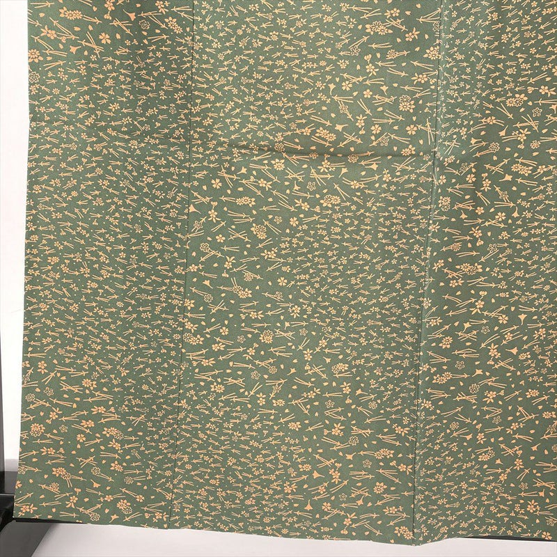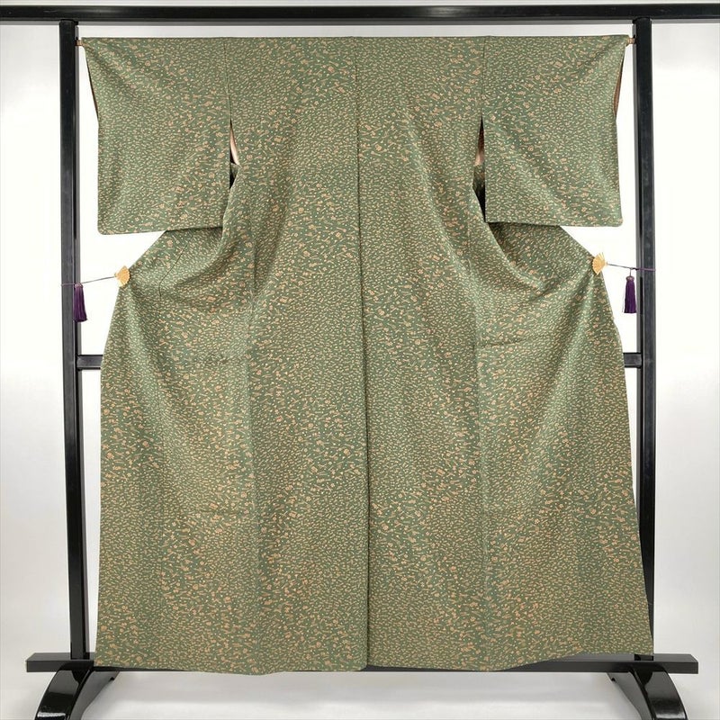 (中古) 単衣小紋 緑 苔色 カジュアル 吹き寄せ 松葉 桜 ひとえ S【身丈】156.5cm【裄丈】67.5cm