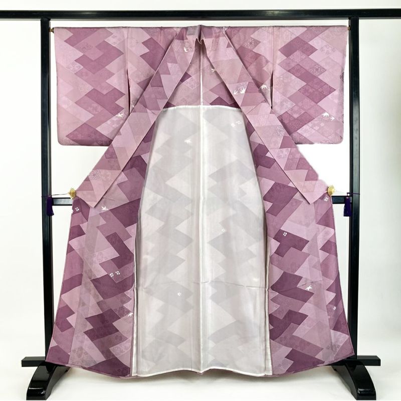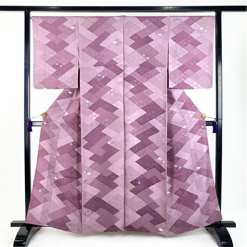 (中古) 単衣小紋 藤色 紫 カジュアル 地紋織り 縫い取り 菱に四季花 ひとえ S【身丈】156cm【裄丈】67cm