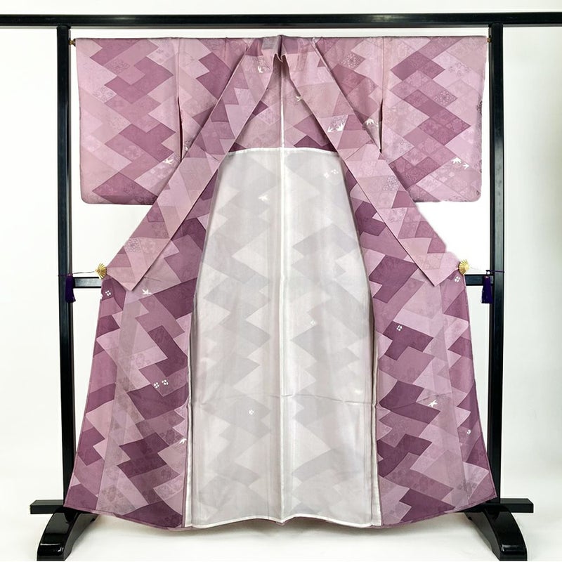単衣の着物は裏地がついていません、袷の着物よりも軽く、風通しが良いのが特徴です。 袷ほど着る期間は長くないですが、春に急に気温が上がったときや、まだ暑さの残っている秋口に活躍します。現在は、温暖化のため単衣を長い期間(2ヶ月~5ヶ月未満)着用する人が増えてきました。保存臭がややございます。
