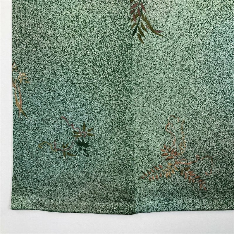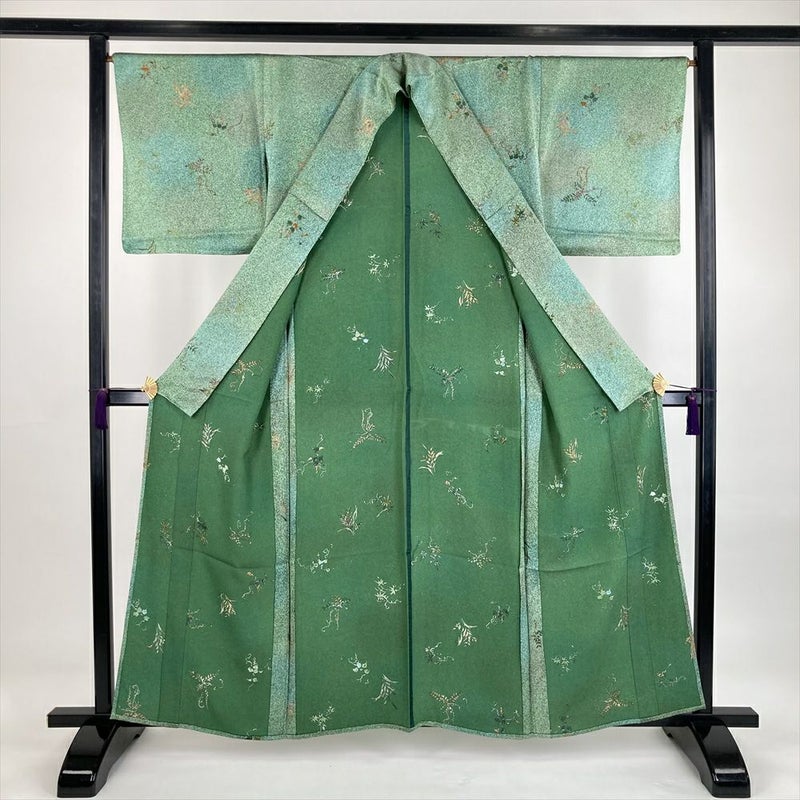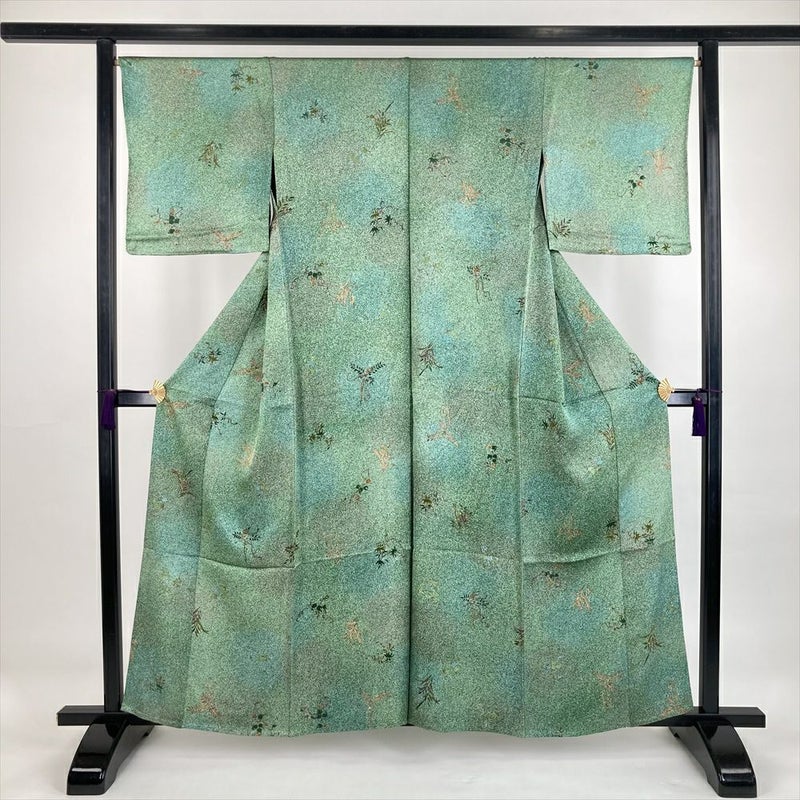 (中古) 単衣小紋 緑色 カジュアル ぼかし染め 吹雪 四季花 ひとえ S【身丈】155cm【裄丈】66cm