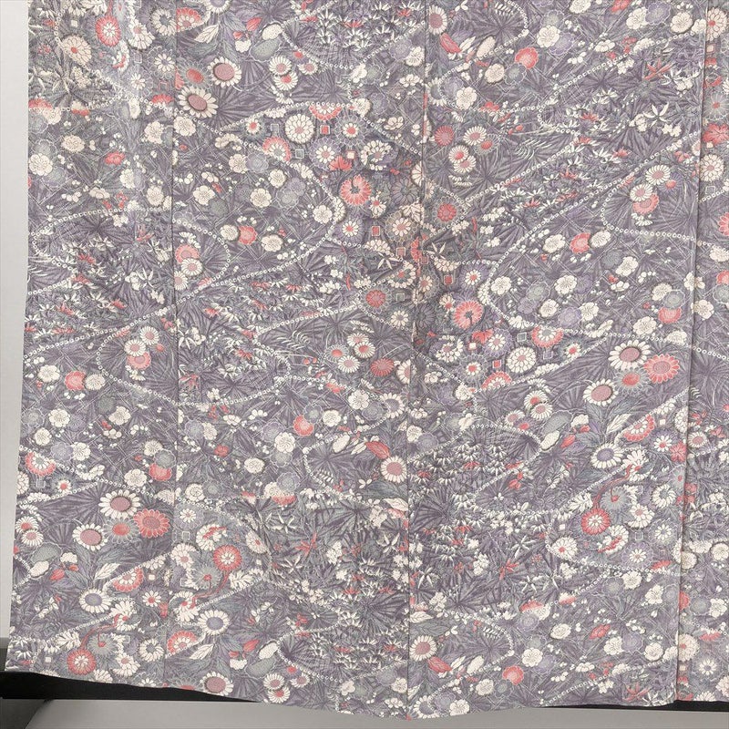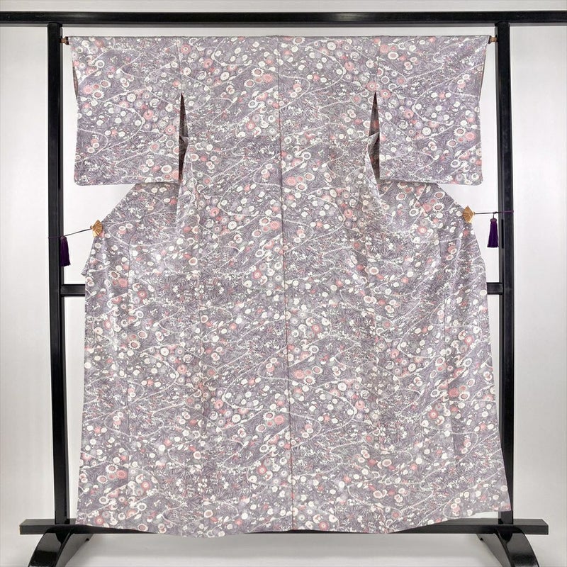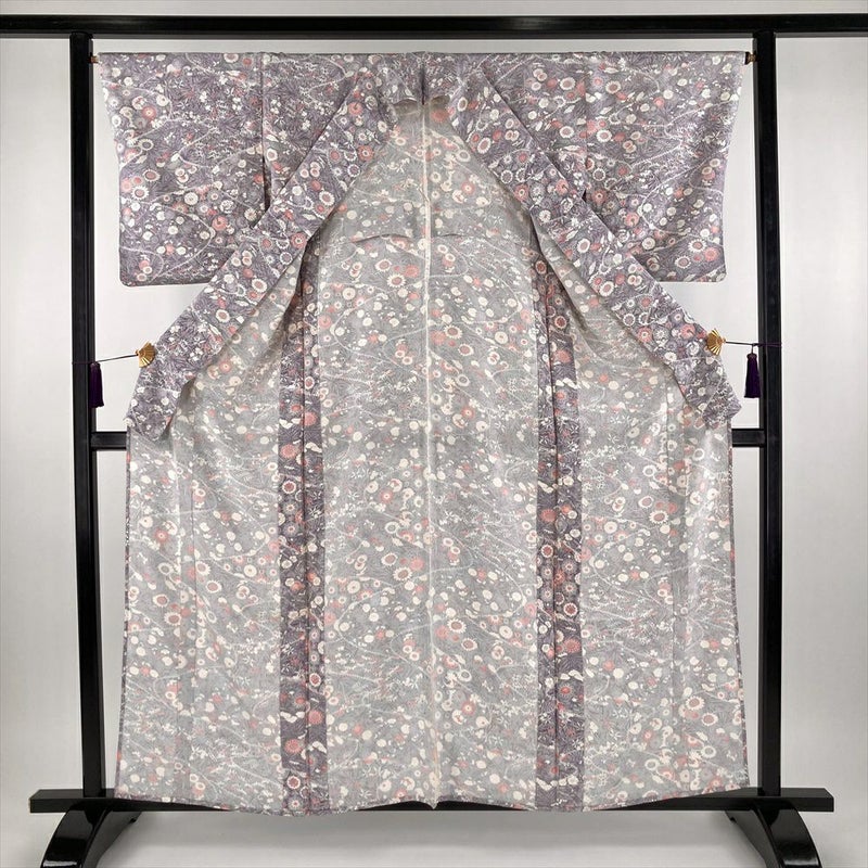(中古) 単衣小紋 紫 薄藤色 カジュアル ちりめん 割り付け 四季花 ひとえ SS【身丈】154cm【裄丈】66cm