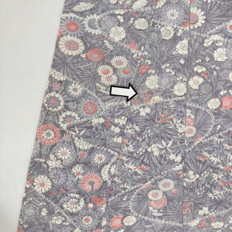 単衣の着物は裏地がついていません、袷の着物よりも軽く、風通しが良いのが特徴です。 袷ほど着る期間は長くないですが、春に急に気温が上がったときや、まだ暑さの残っている秋口に活躍します。現在は、温暖化のため単衣を長い期間(2ヶ月~5ヶ月未満)着用する人が増えてきました。保存臭がややございます。左前、背縫い裏、袖後に汚れがございます。