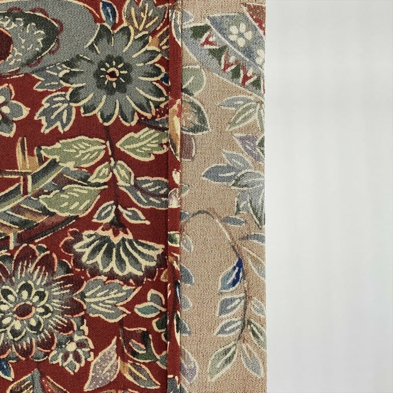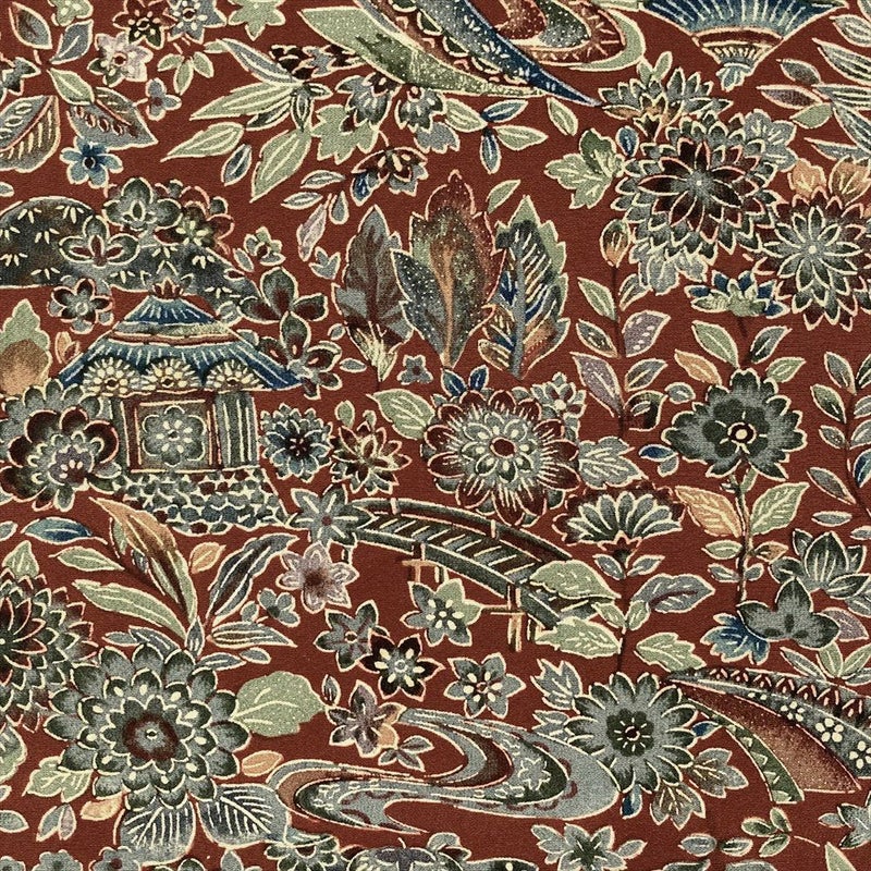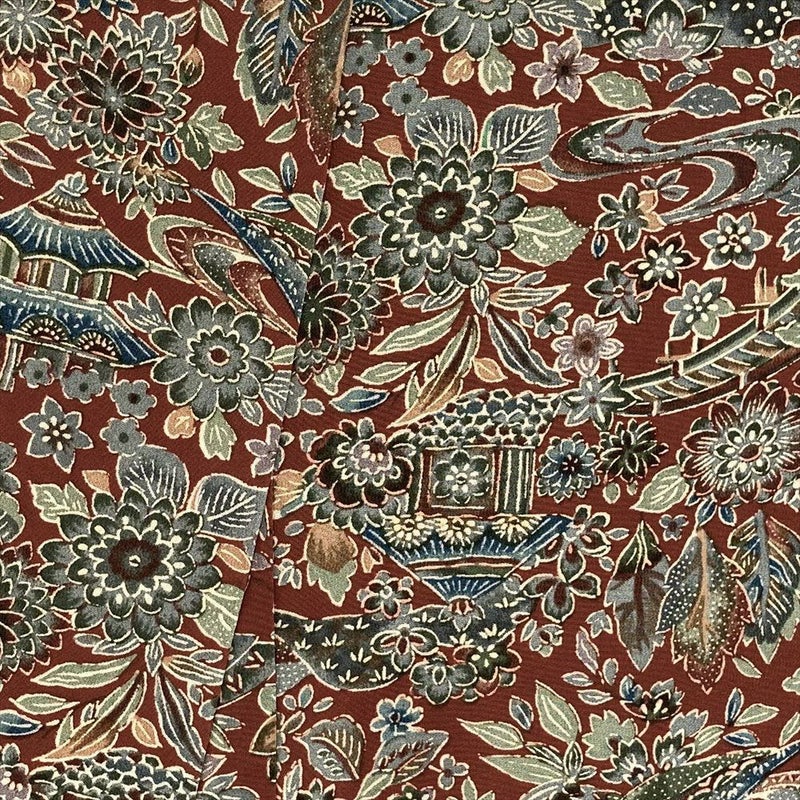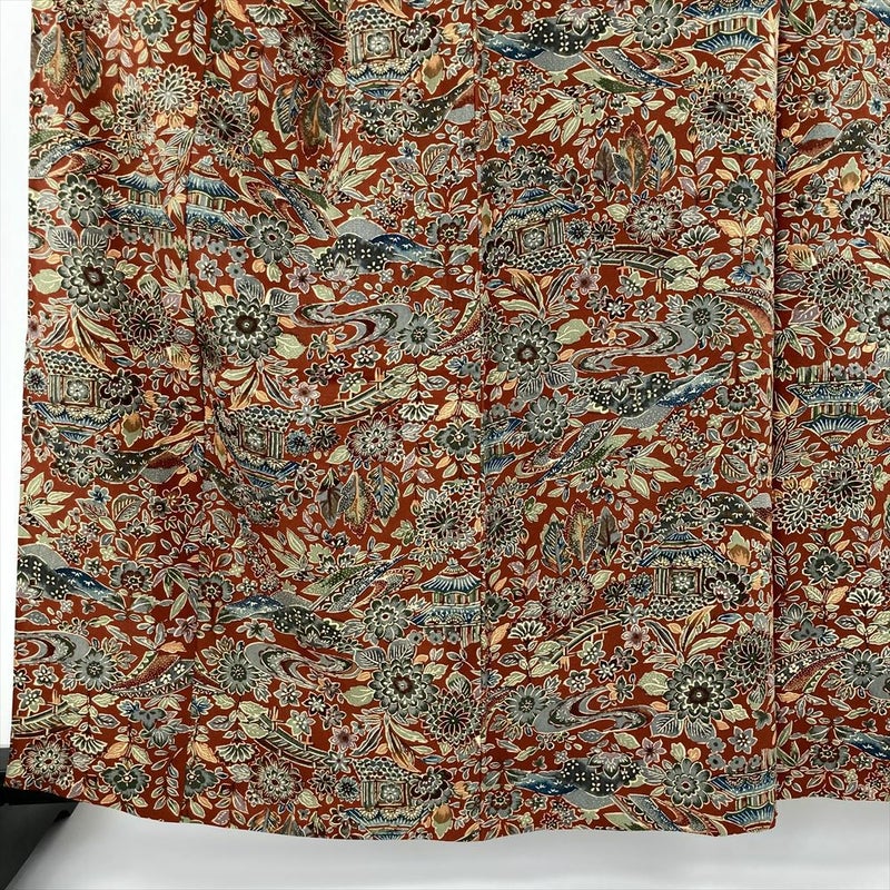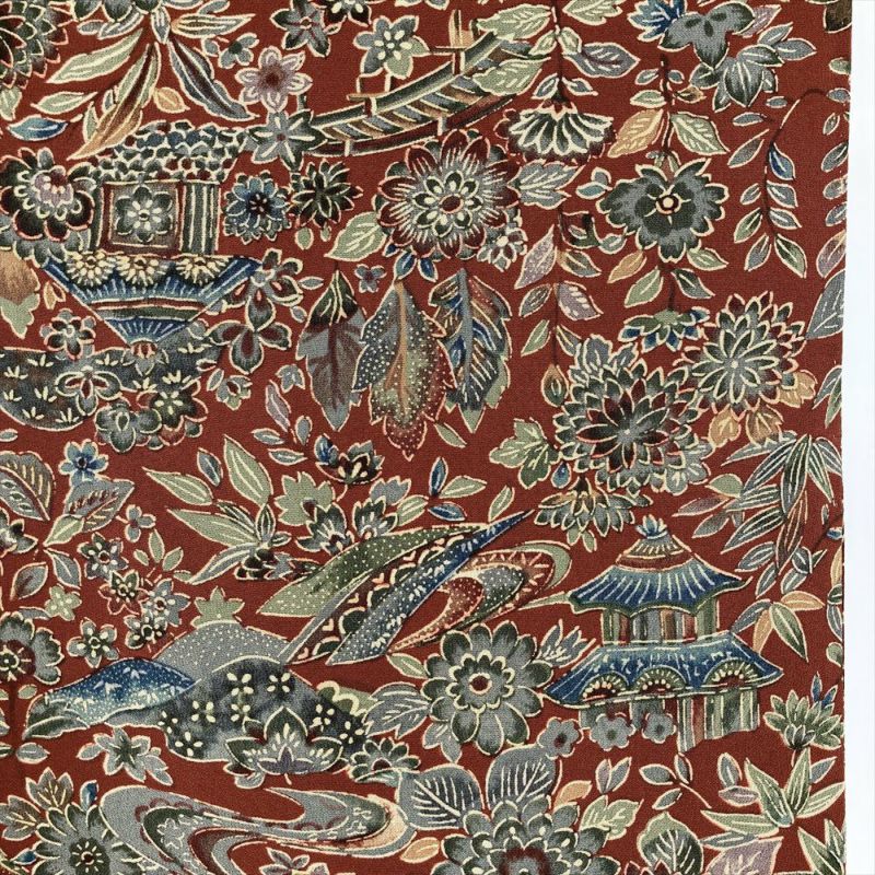 【色柄】赤茶色 カジュアル ちりめん 紅型調 家屋 四季花