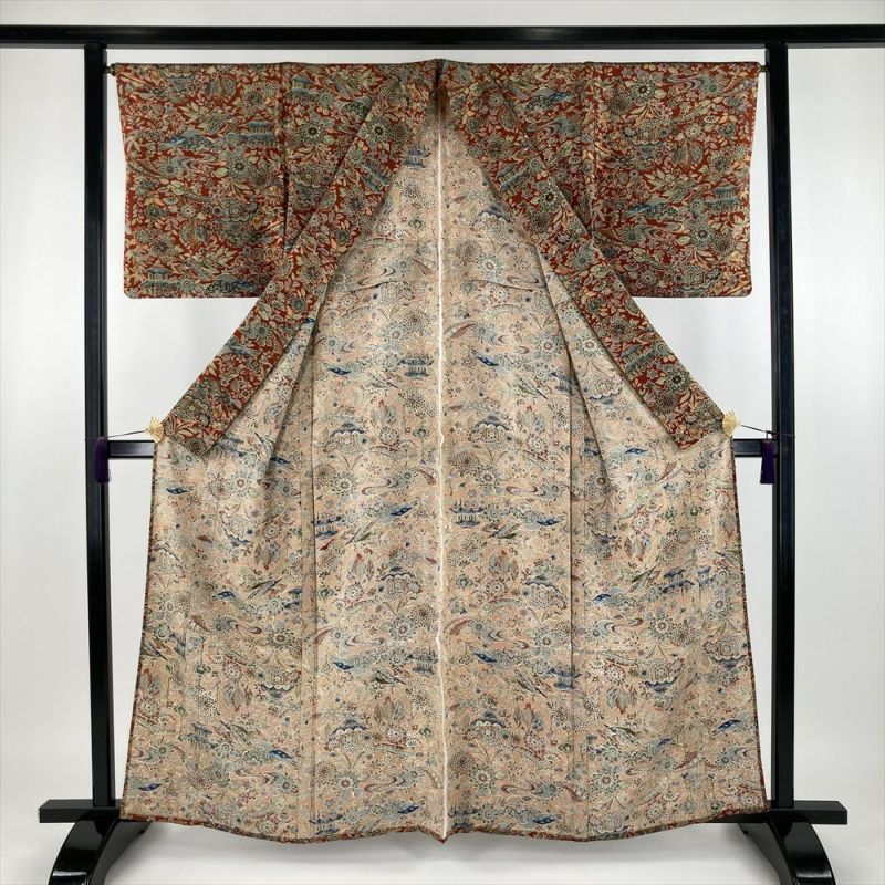 (中古) 単衣小紋 赤茶色 カジュアル ちりめん 紅型調 家屋 四季花 ひとえ S【身丈】156cm【裄丈】66.5cm