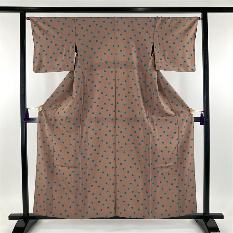 (中古) 単衣小紋 茶 薄紅梅色 カジュアル ちりめん 水玉 ひとえ SS【身丈】154cm【裄丈】65.5cm
