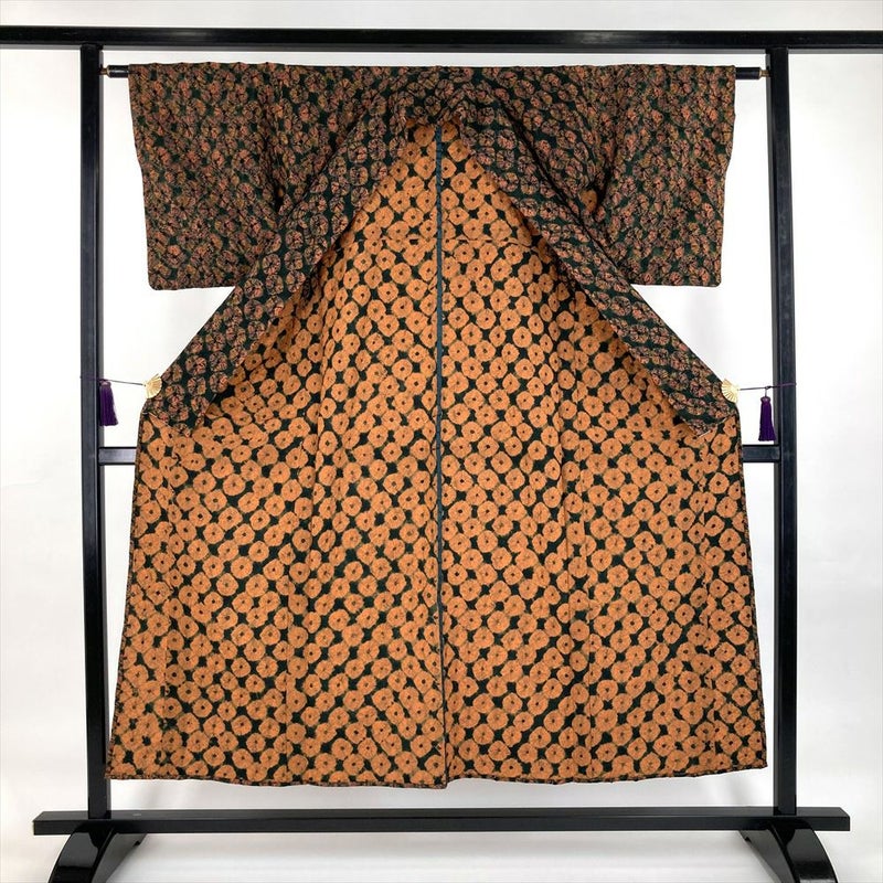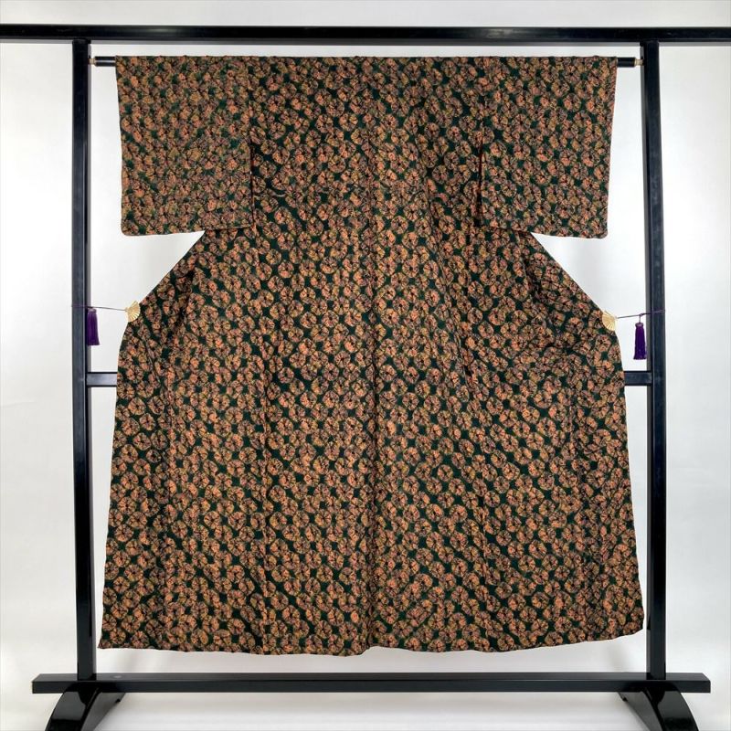 (中古) 単衣小紋 深緑色 カジュアル 絞り 唐花 オリエンタル ひとえ SS【身丈】148cm【裄丈】62cm