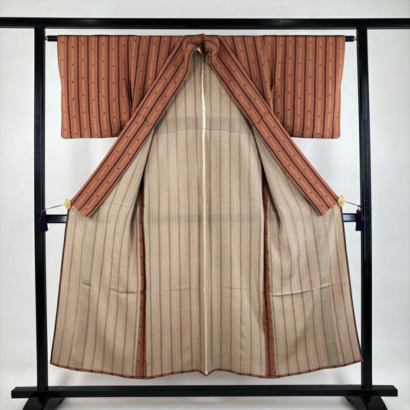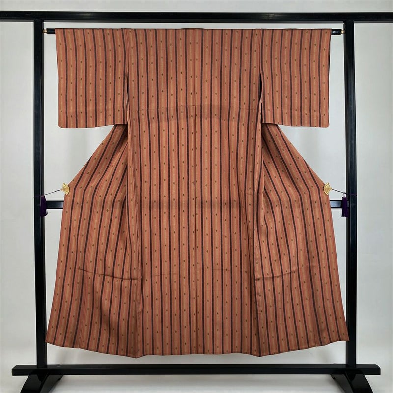 (中古) 単衣小紋 薄赤茶色 カジュアル ちりめん 金彩 間道 松梅 ひとえ SS【身丈】144.5cm【裄丈】62.5cm