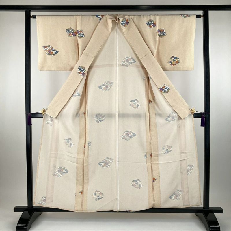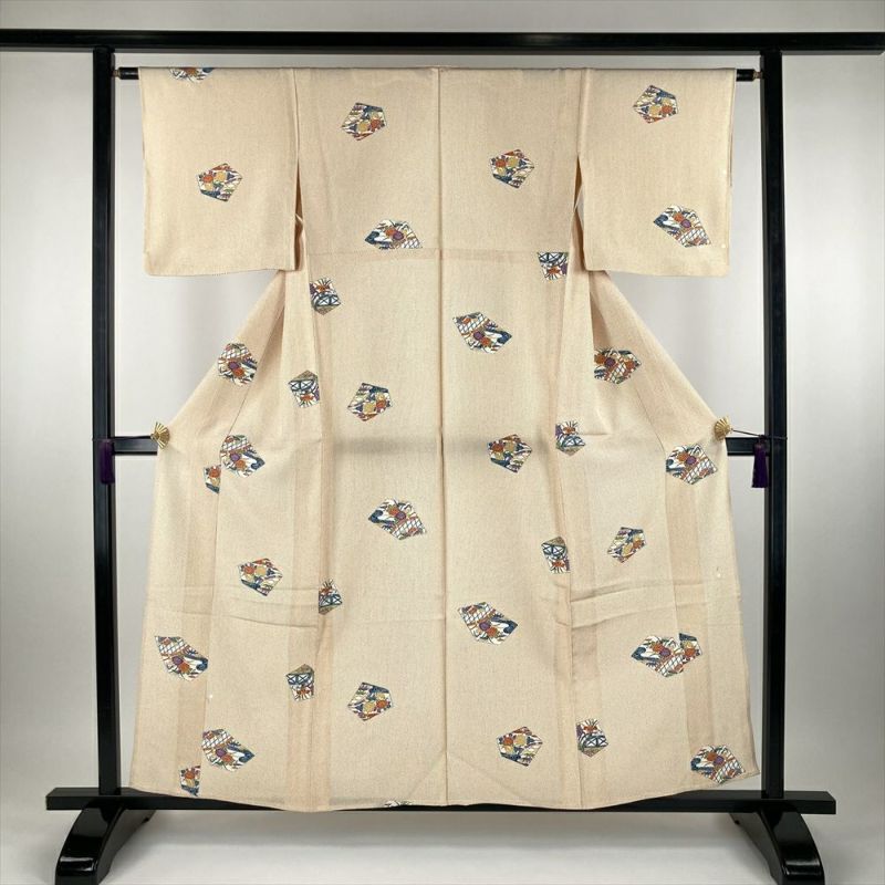 (中古) 単衣小紋 生成り色 カジュアル ちりめん 紅型染め調 水辺の景色 ひとえ SS【身丈】153.5cm【裄丈】63cm