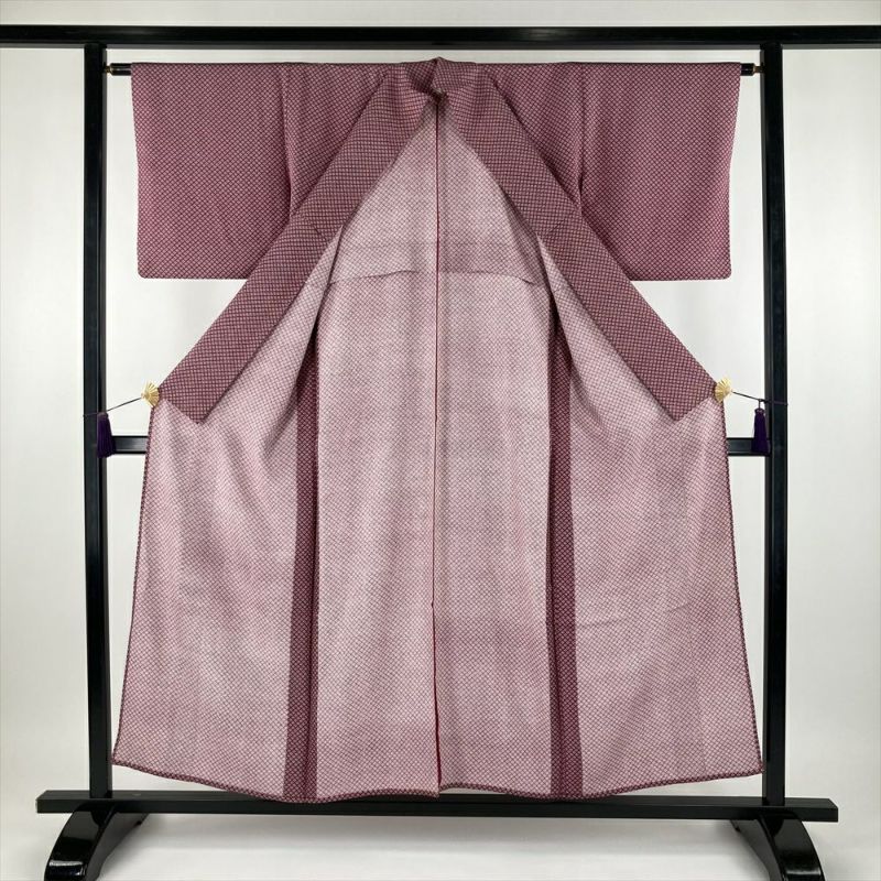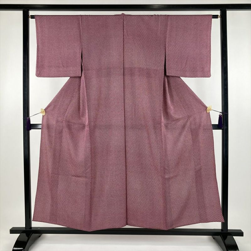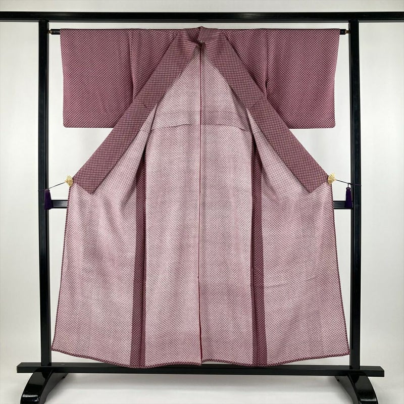 (中古) 単衣小紋 紫色 小豆色 カジュアル ちりめん 菱に七宝 ひとえ SS【身丈】147.5cm【裄丈】63cm