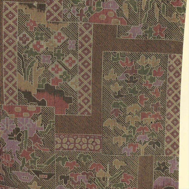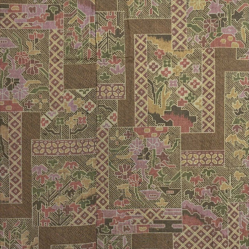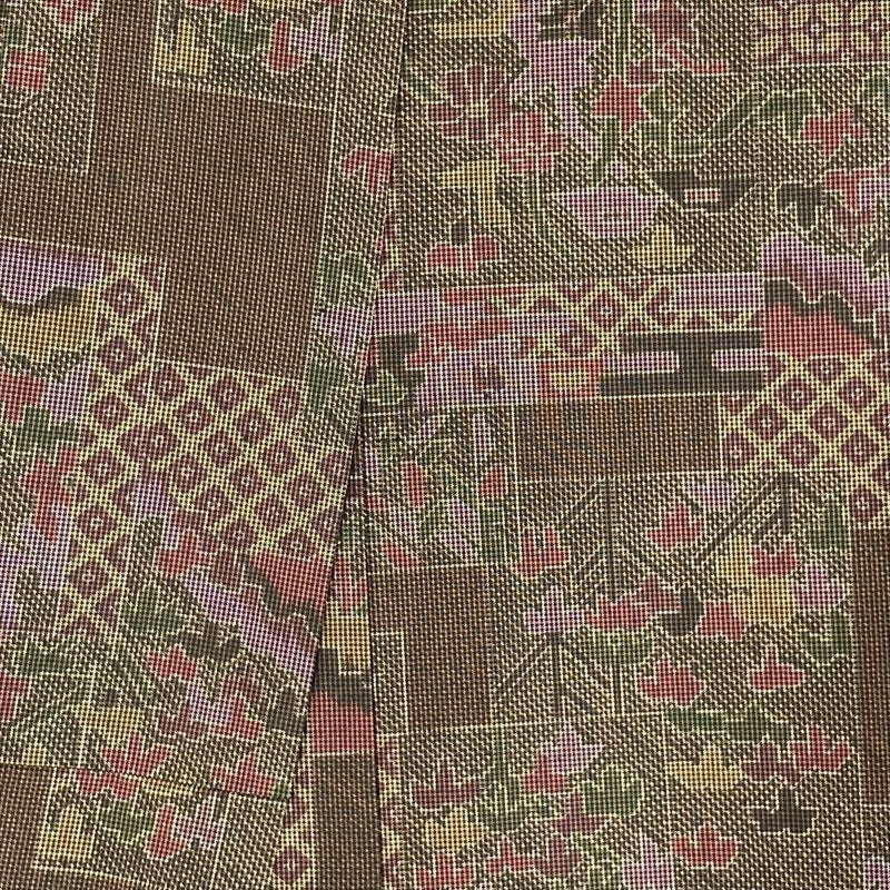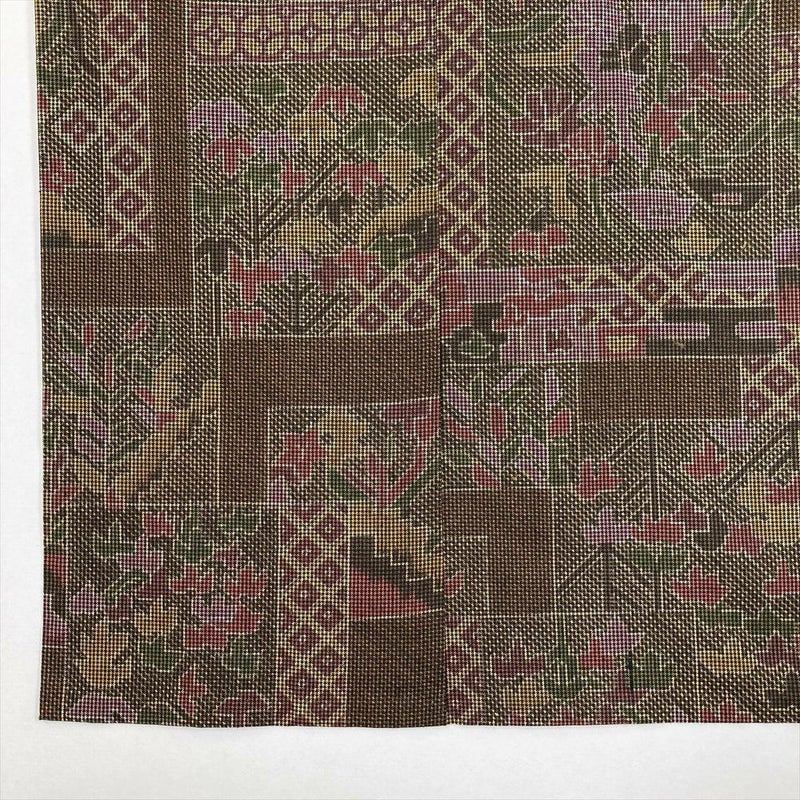 【色柄】茶色 カジュアル 紬地 絣調 切り嵌め 四季花
