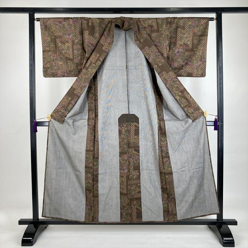 (中古) 単衣小紋 茶色 カジュアル 紬地 絣調 切り嵌め 四季花 ひとえ SS【身丈】152cm【裄丈】64cm
