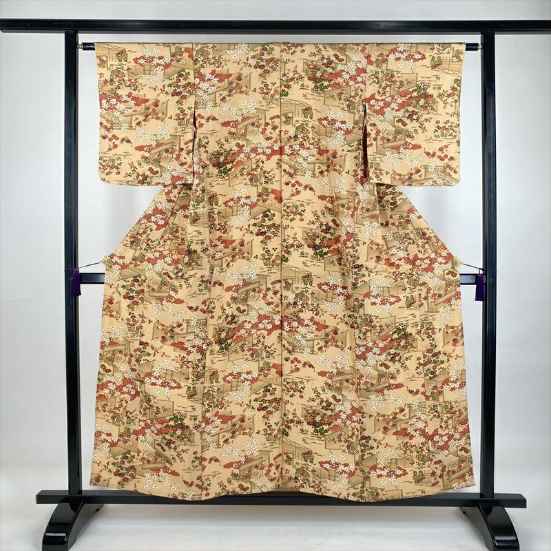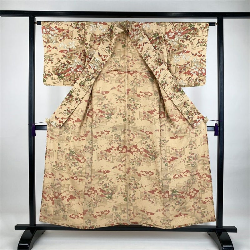 (中古) 単衣小紋 ベージュ色 カジュアル ちりめん 四季花 垣根 ひとえ SS【身丈】150cm【裄丈】62cm