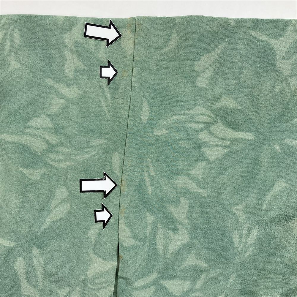 単衣の着物は裏地がついていません、袷の着物よりも軽く、風通しが良いのが特徴です。 袷ほど着る期間は長くないですが、春に急に気温が上がったときや、まだ暑さの残っている秋口に活躍します。現在は、温暖化のため単衣を長い期間(2ヶ月~5ヶ月未満)着用する人が増えてきました。右後身頃に黄色い汚れがございます。左袖と居敷当てに汚れがございます。