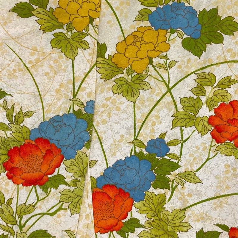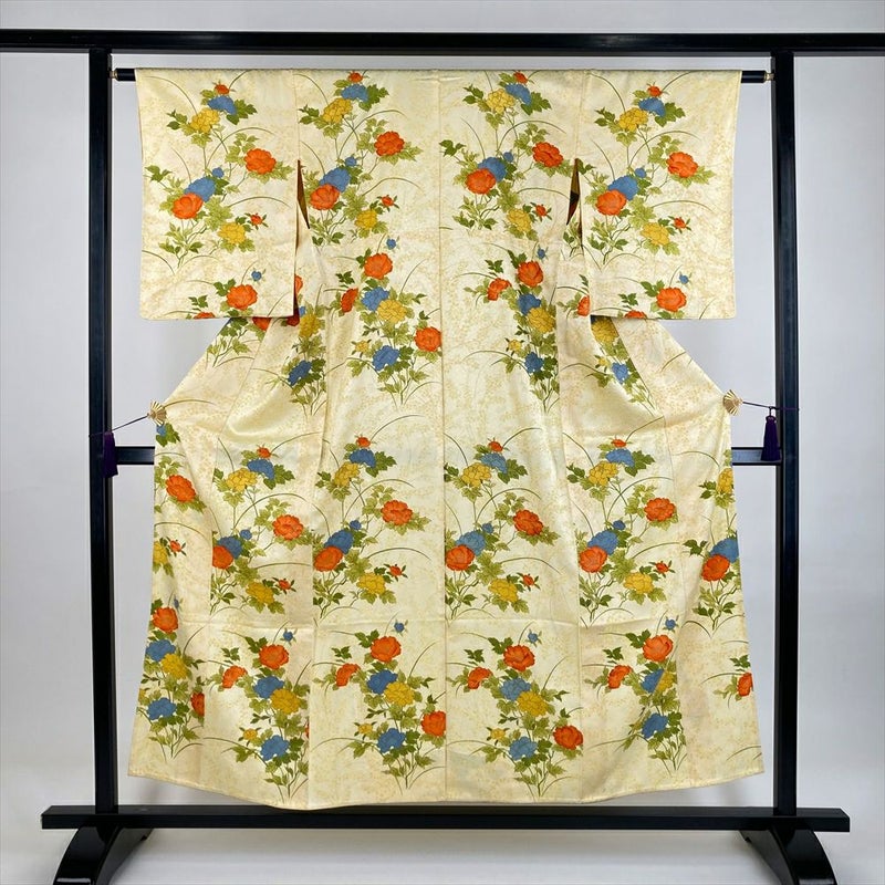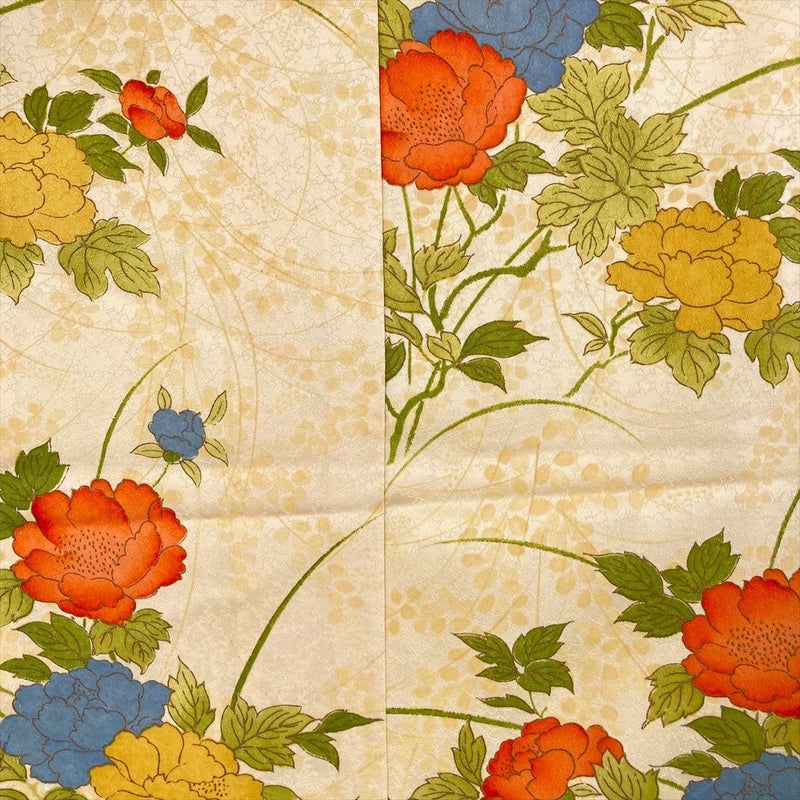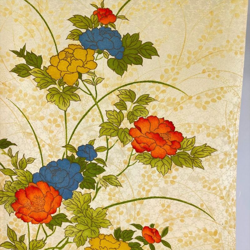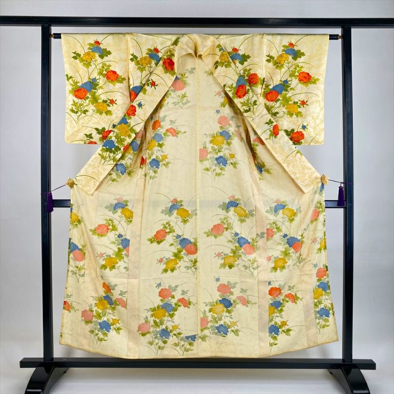 単衣の着物は裏地がついていません、袷の着物よりも軽く、風通しが良いのが特徴です。 袷ほど着る期間は長くないですが、春に急に気温が上がったときや、まだ暑さの残っている秋口に活躍します。現在は、温暖化のため単衣を長い期間(2ヶ月~5ヶ月未満)着用する人が増えてきました。経年劣化による金彩の黒変がございます保存臭がややございます。
