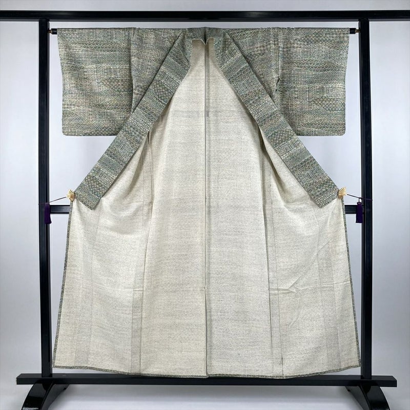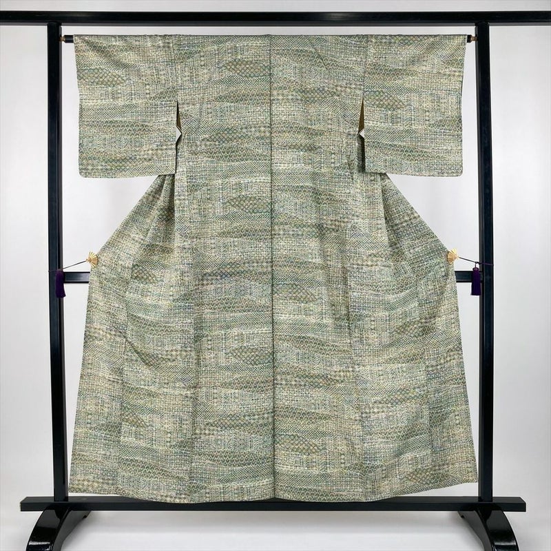 (中古) 単衣小紋 緑色 カジュアル 伊勢型調 オリエンタル ひとえ SS【身丈】151.5cm【裄丈】64.5cm