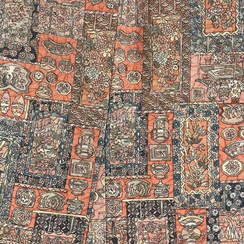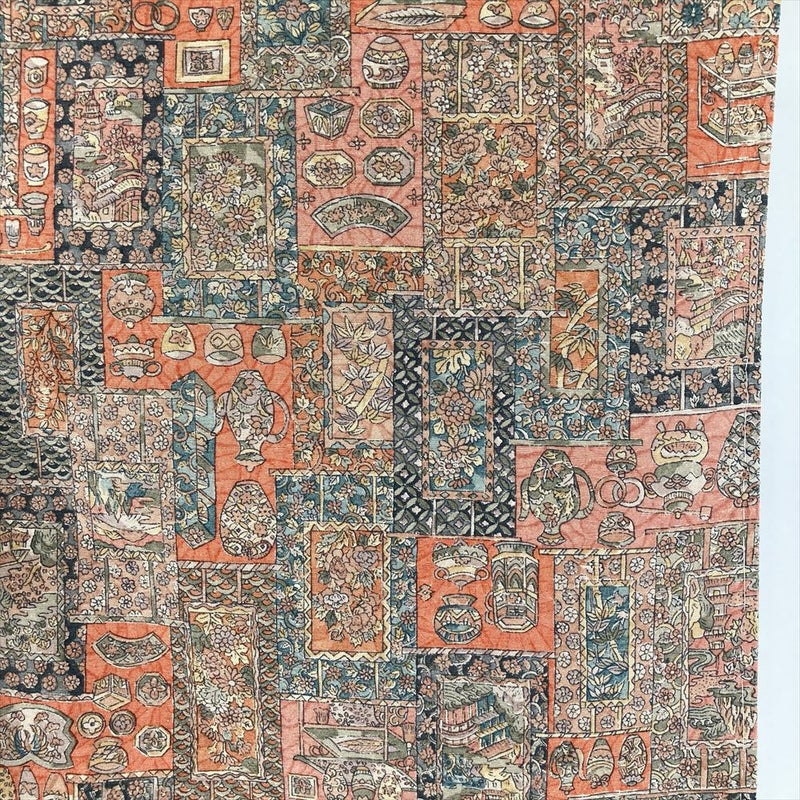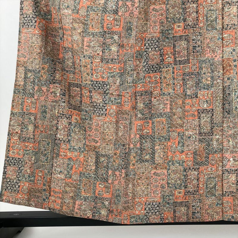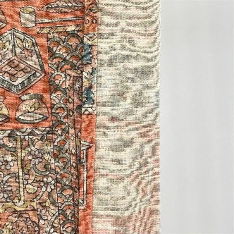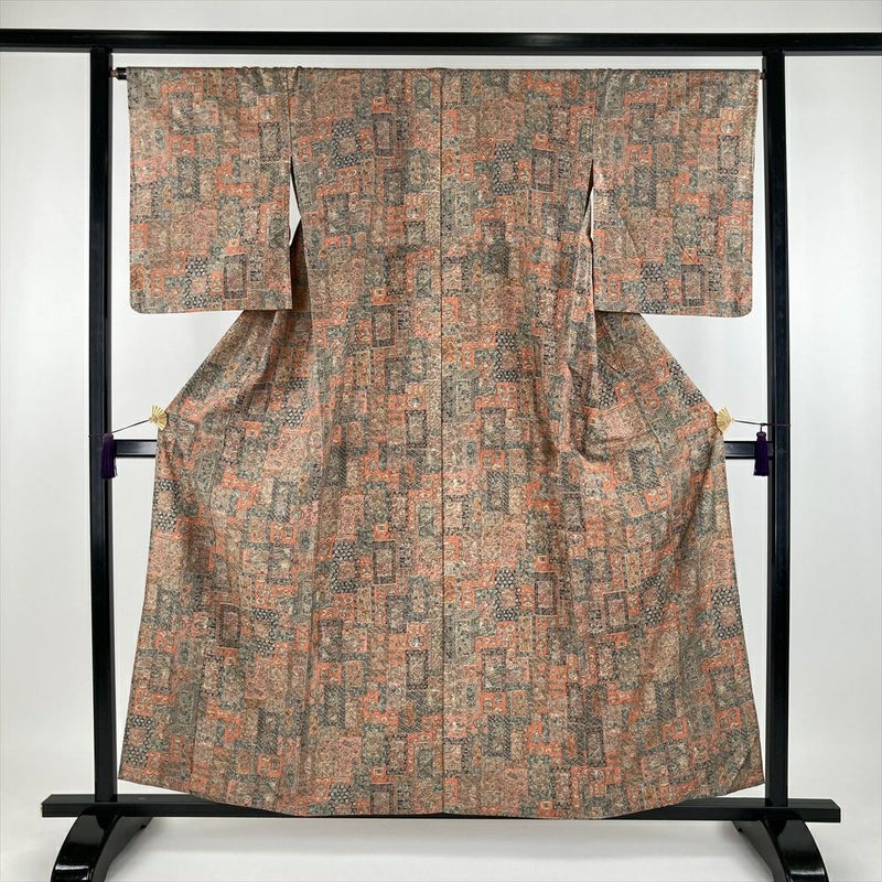 (中古) 単衣小紋 柿色 オレンジ カジュアル 紬地 焼き物 掛け軸 ひとえ SS【身丈】154cm【裄丈】66.5cm