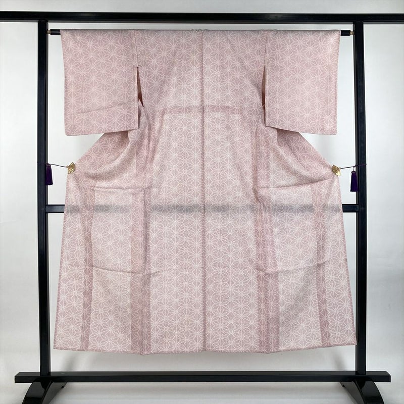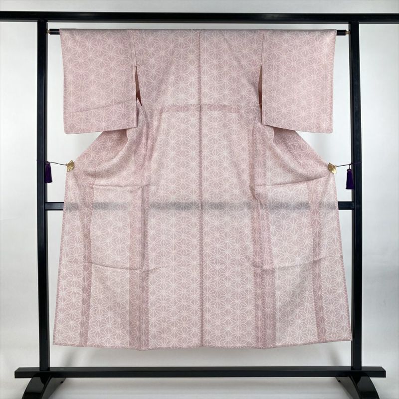 (中古) 単衣小紋 生成り色 赤色 赤紫 カジュアル 紬地 シボ感 麻の葉 ひとえ SS【身丈】145cm【裄丈】62cm
