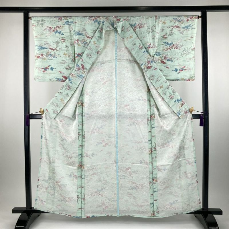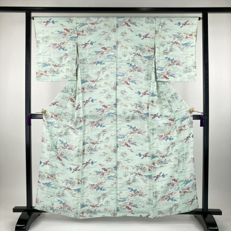 (中古) 単衣小紋 薄緑色 水色 カジュアル 地紋織り 四季花 水辺の景色 ひとえ S【身丈】159.5cm【裄丈】65.5cm