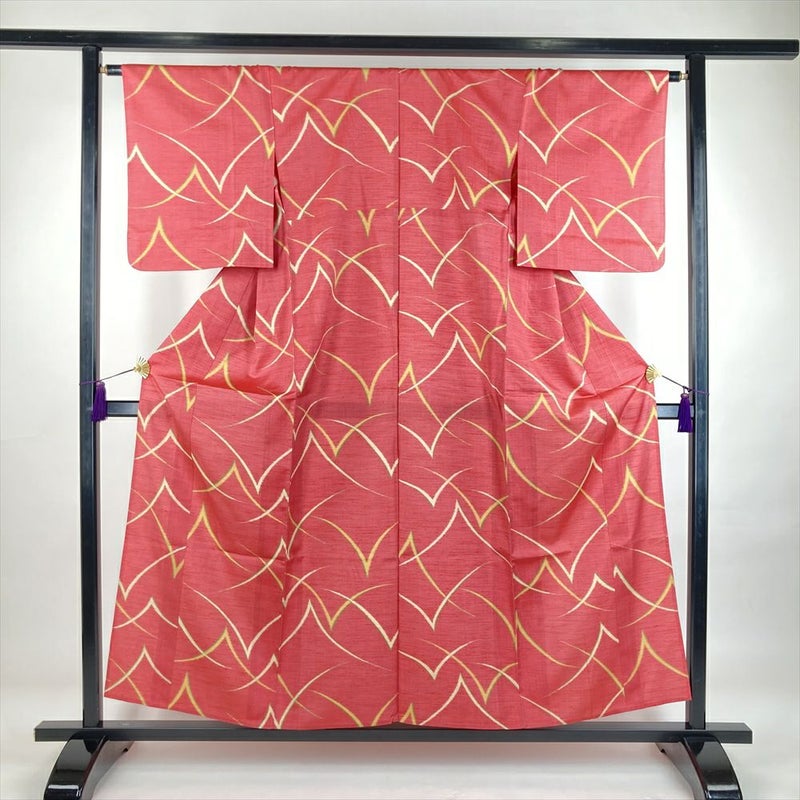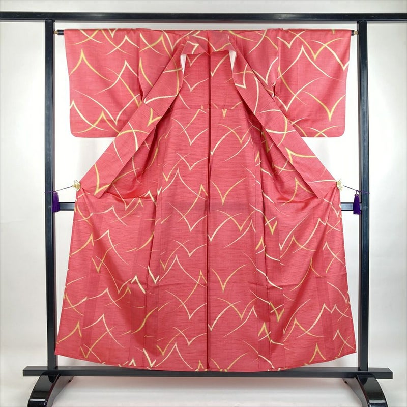 (中古) 単衣小紋 ローズピンク色 カジュアル 紬地 松葉 抽象柄 ひとえ SS【身丈】152cm【裄丈】64.5cm