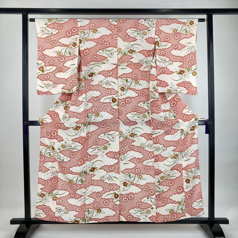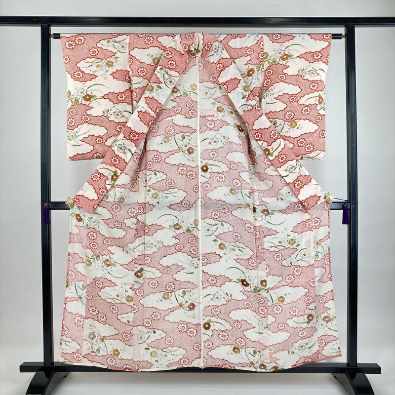 (中古) 単衣小紋 生成り色 赤色 カジュアル ちりめん 雲 辻が花 鹿の子 ひとえ SS【身丈】152cm【裄丈】62.5cm