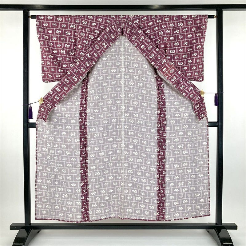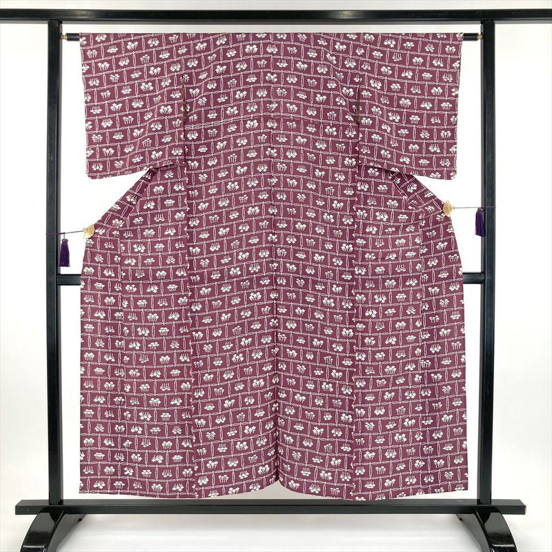 (中古) 単衣小紋 紫 小豆色 カジュアル ちりめん 割り付け 小花 ひとえ SS【身丈】152cm【裄丈】63cm