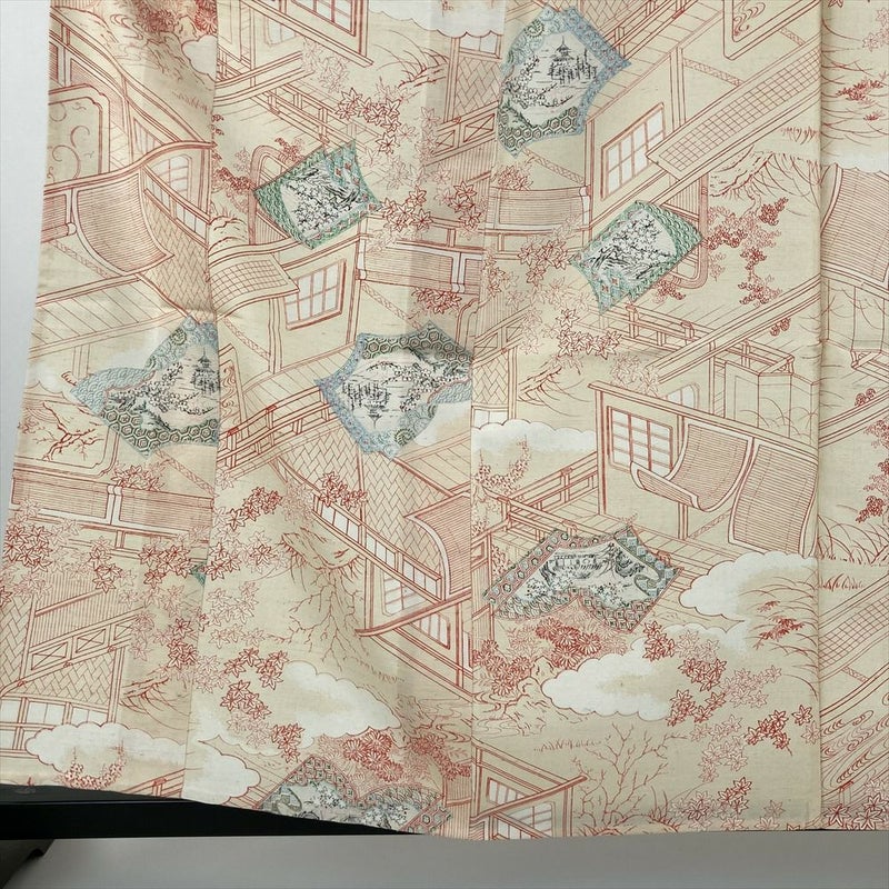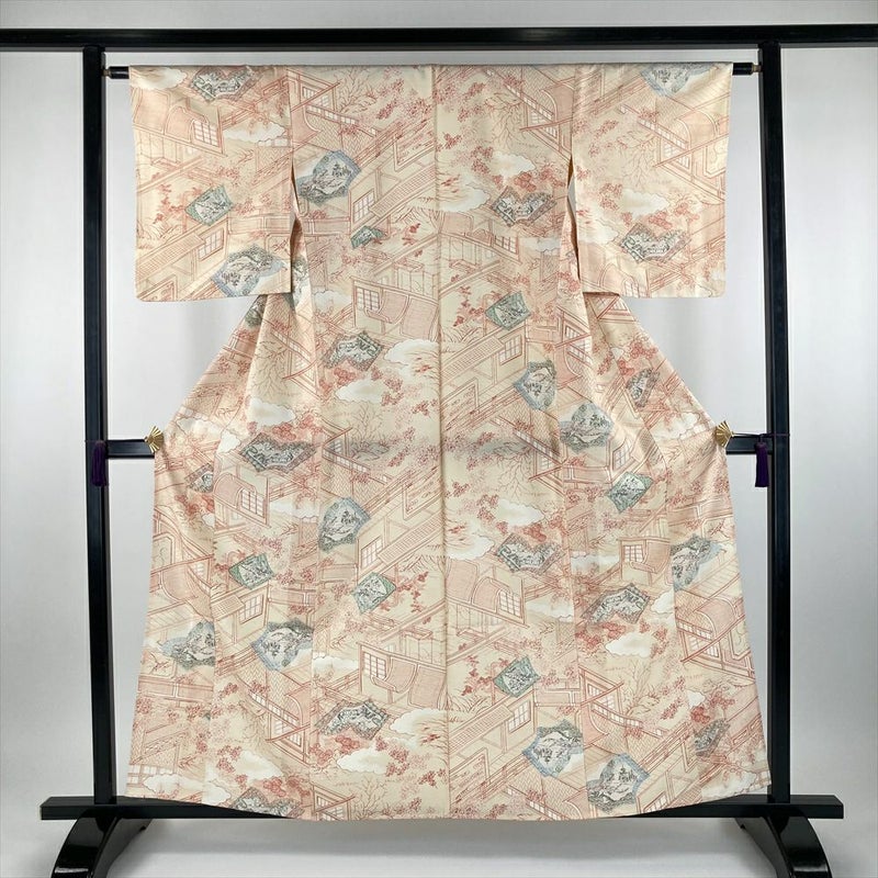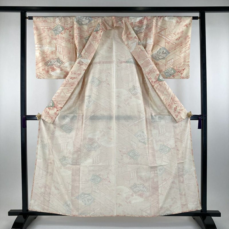 (中古) 単衣小紋 生成り色 カジュアル 紬地 冊子 宮殿 四季花 ひとえ SS【身丈】154.5cm【裄丈】63cm