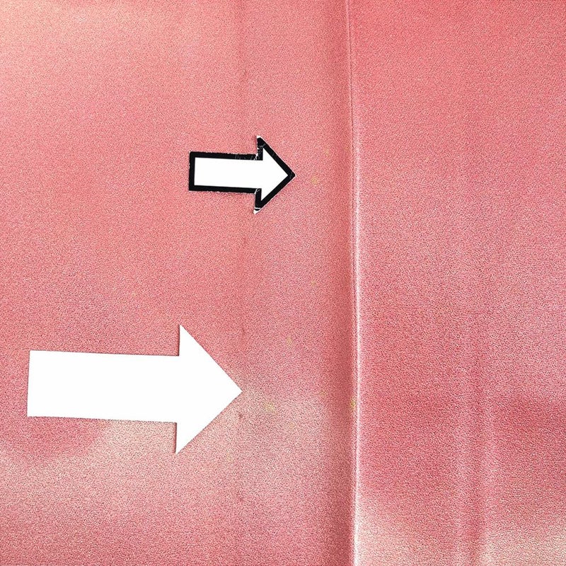 単衣の着物は裏地がついていません、袷の着物よりも軽く、風通しが良いのが特徴です。 袷ほど着る期間は長くないですが、春に急に気温が上がったときや、まだ暑さの残っている秋口に活躍します。現在は、温暖化のため単衣を長い期間(2ヶ月~5ヶ月未満)着用する人が増えてきました。上前(脇縫い)に黄色い色飛びがございます。左後に汚れがございます。保存臭がややございます。