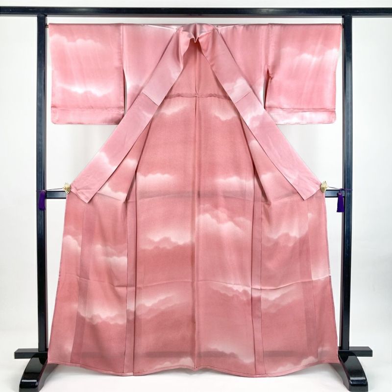(中古) 単衣小紋 ピンク色 カジュアル ぼかし染め 雲 霞 ひとえ M【身丈】161cm【裄丈】67.5cm