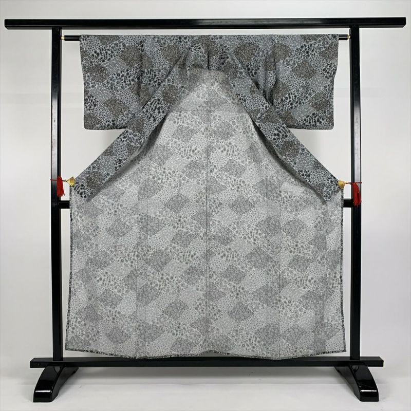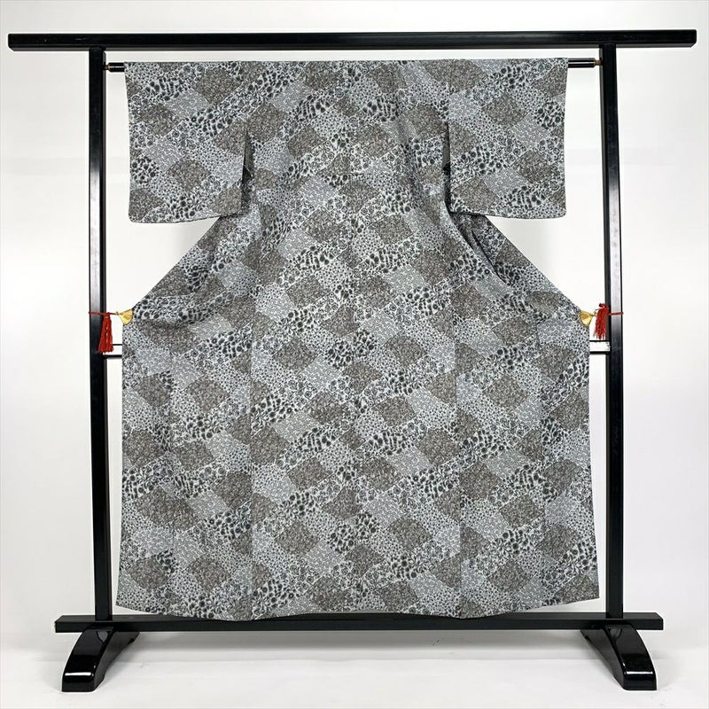 (中古)単衣小紋 グレー カジュアル 縮緬 小花 菱 ひとえ SS【身丈】154cm【裄丈】63.5cm
