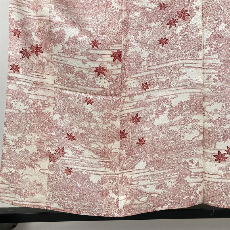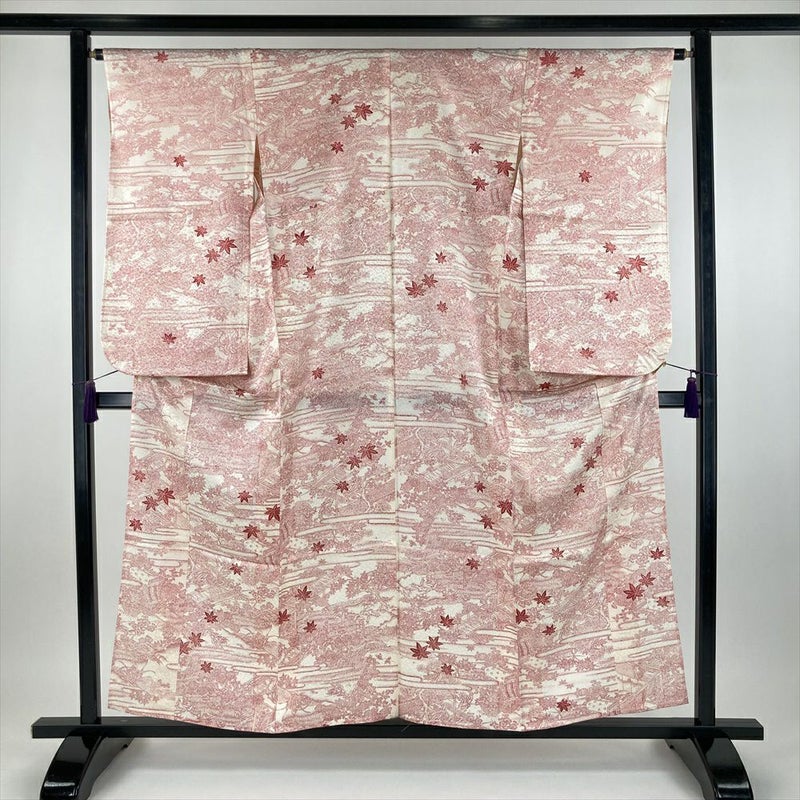 (中古) 単衣小紋 生成り色 カジュアル 地紋織り 殿と姫 御所車 四季花 ひとえ SS【身丈】152.5cm【裄丈】65.5cm