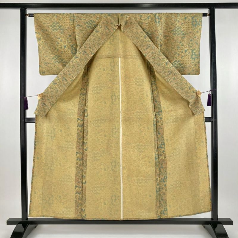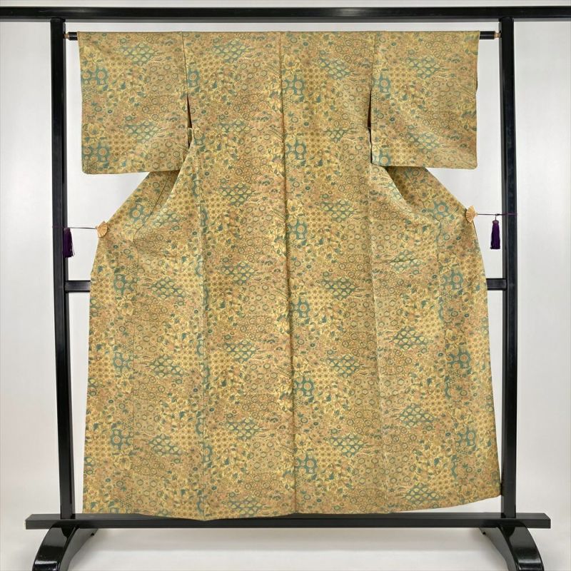 (中古) 単衣小紋 黄緑 鶸色 青緑色 カジュアル 紬地 和更紗 吉祥柄 ひとえ SS【身丈】153.5cm【裄丈】63.5cm