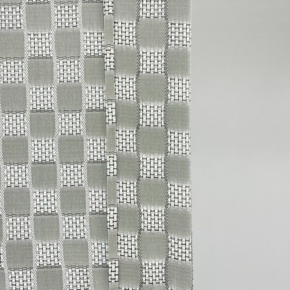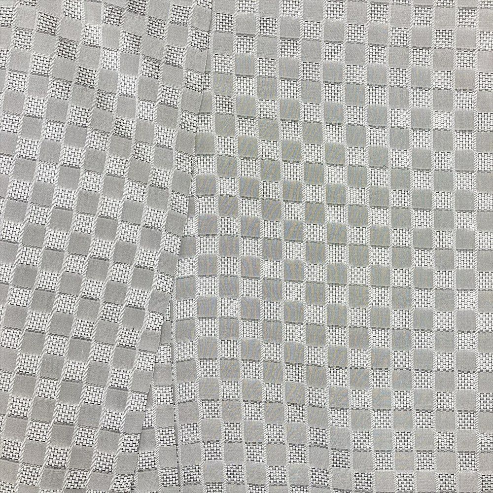 品の良い白鼠色に、モダンな変わり市松文様が映えます。さりげない個性が光る、洗練された着こなしをお楽しみください。