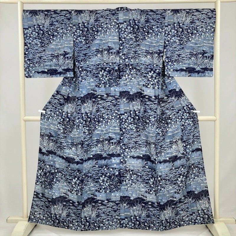 (中古) 単衣小紋 紺 カジュアル 江戸解き 単衣 絹 【身丈】154.5cm【裄丈】69.5cm
