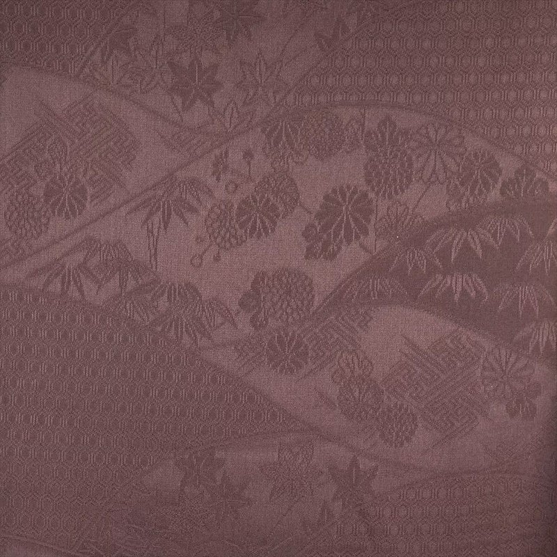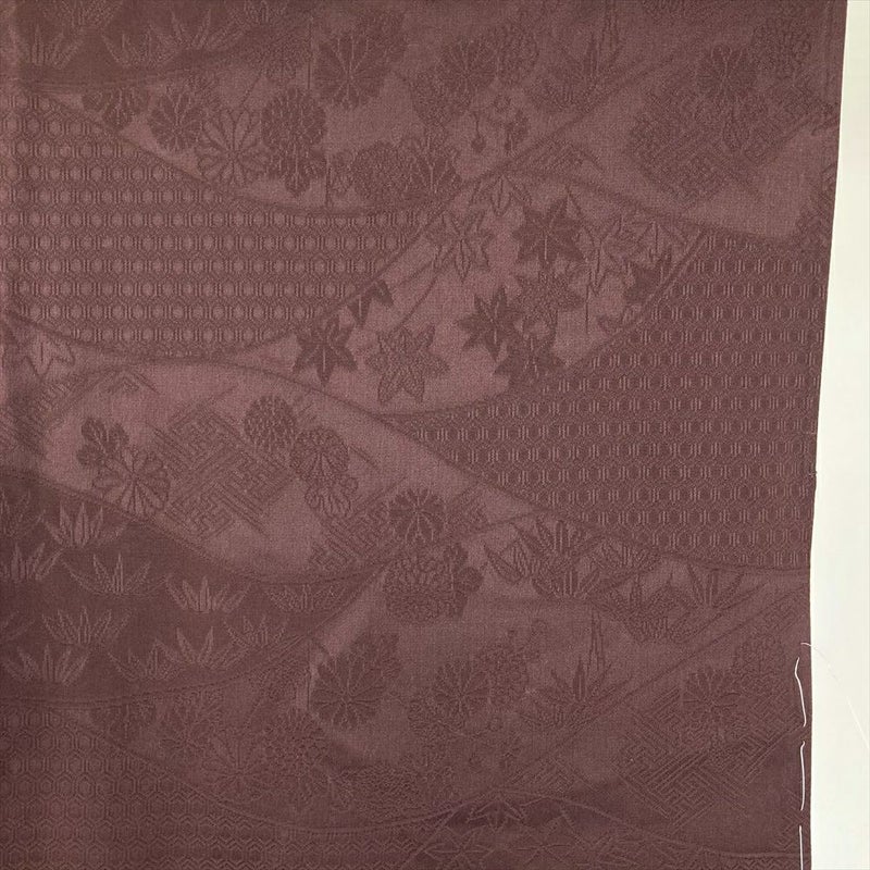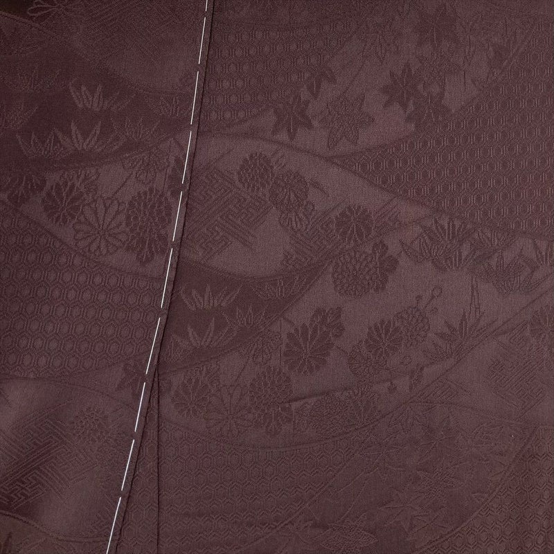 今回ご紹介するのは、上品な焦げ茶色に吉祥文と菊、紅葉の地紋が織り込まれた、美しい単衣の色無地です。