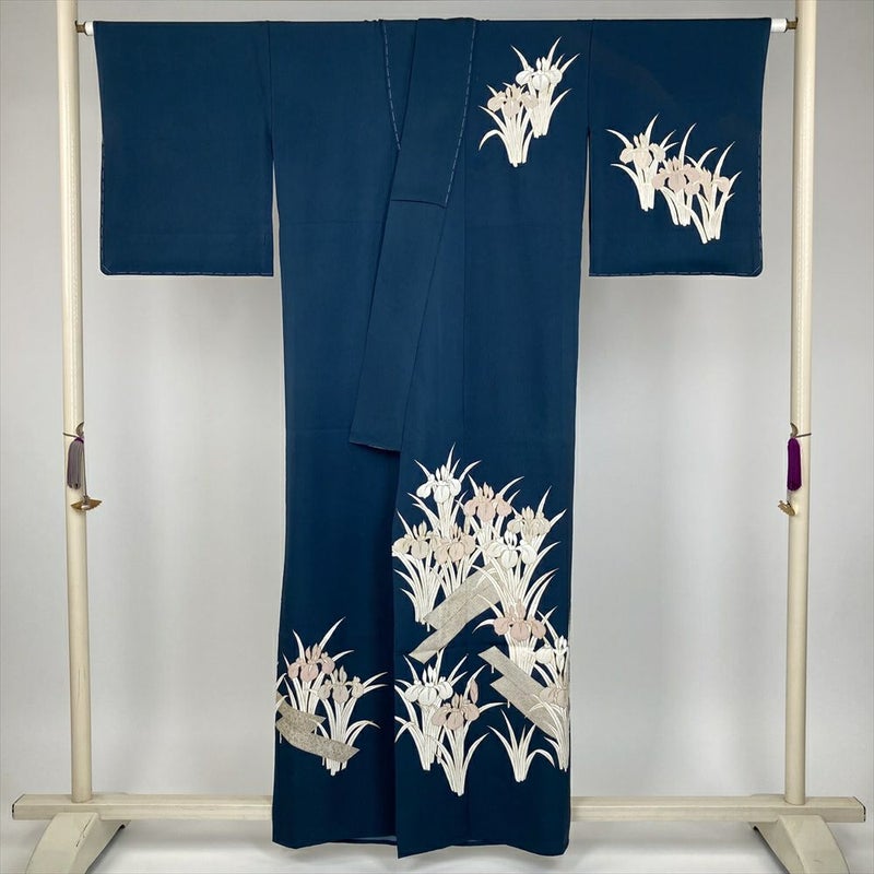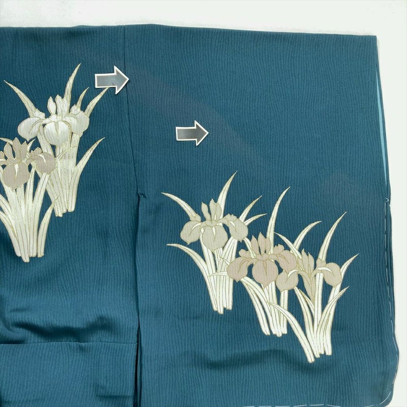 (中古) 訪問着 青緑 セミフォーマル 金彩 菖蒲 単衣 絹【身丈】154.5cm【裄丈】64.5cm
