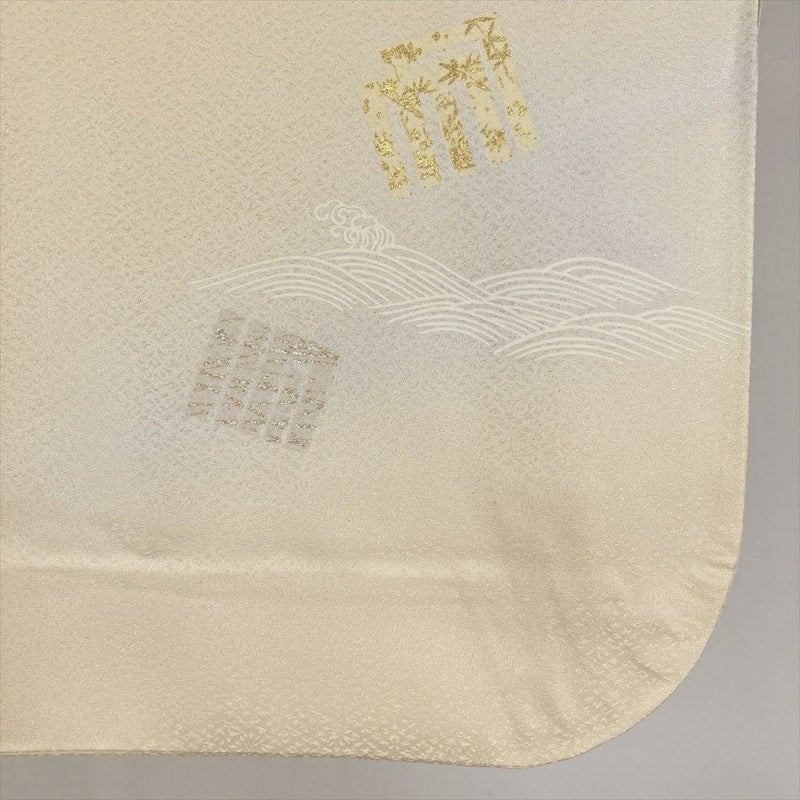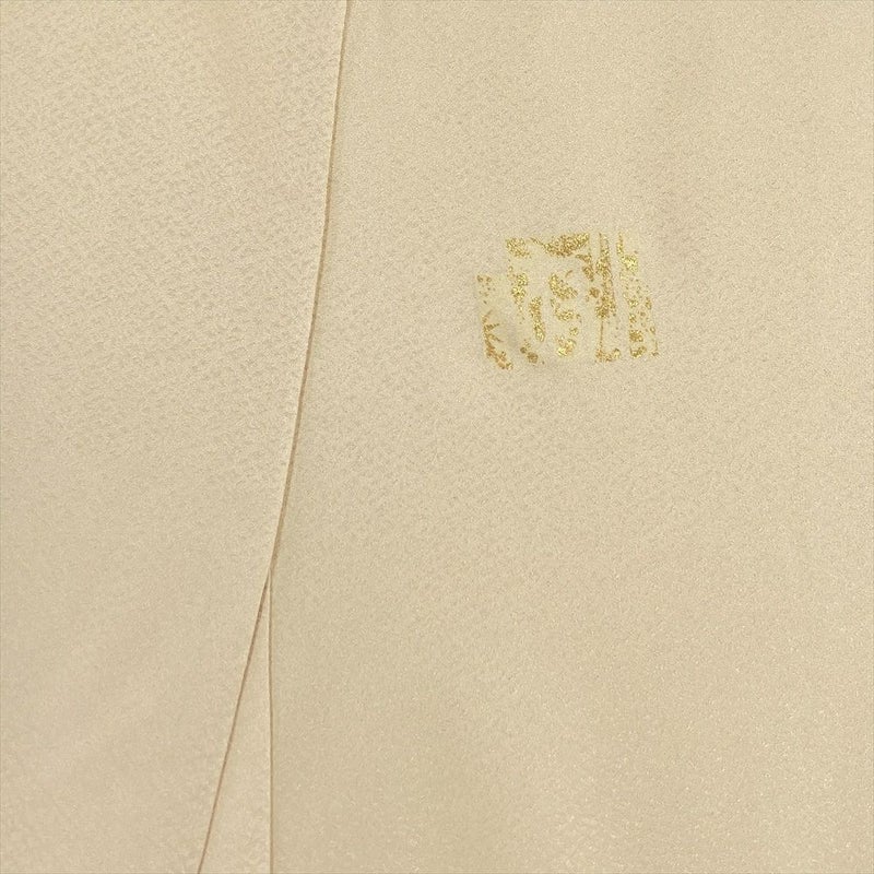 地紋織の生地に、ぼかし染め、金彩、そして金駒刺繍が施された格調高い一枚で、右衽には落款がございます 。