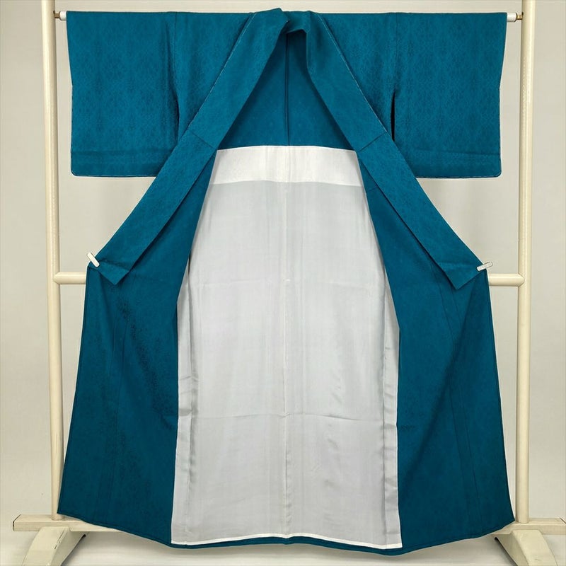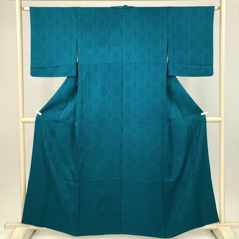 (中古) 単衣色無地 孔雀色 青緑 カジュアル オリエンタル 唐花文様 地紋織り 単衣 絹【身丈】154cm【裄丈】63.5cm