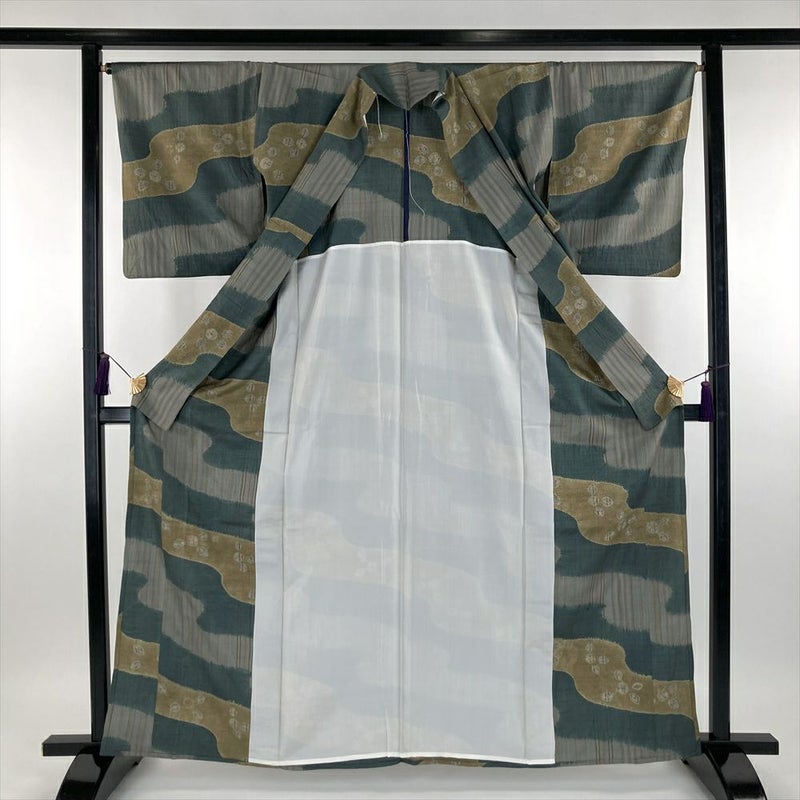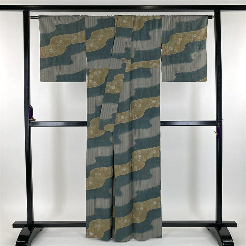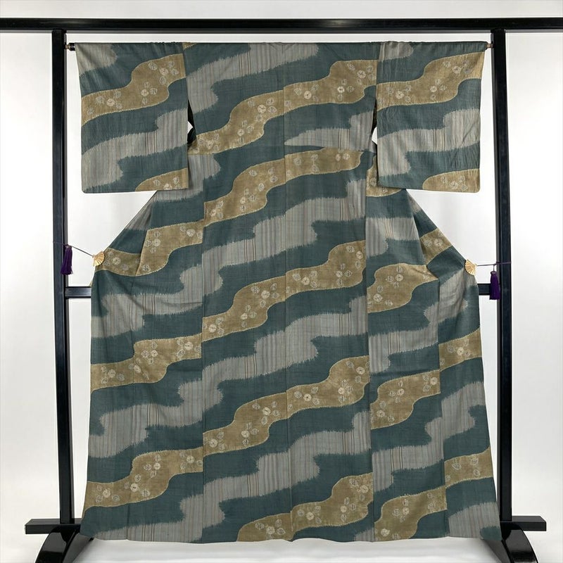 (中古) 単衣紬 藍鼠色 ブルーグレー色 カジュアル 織り 染め 桶絞り ひとえ S【身丈】158cm【裄丈】66cm