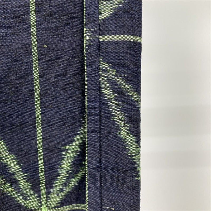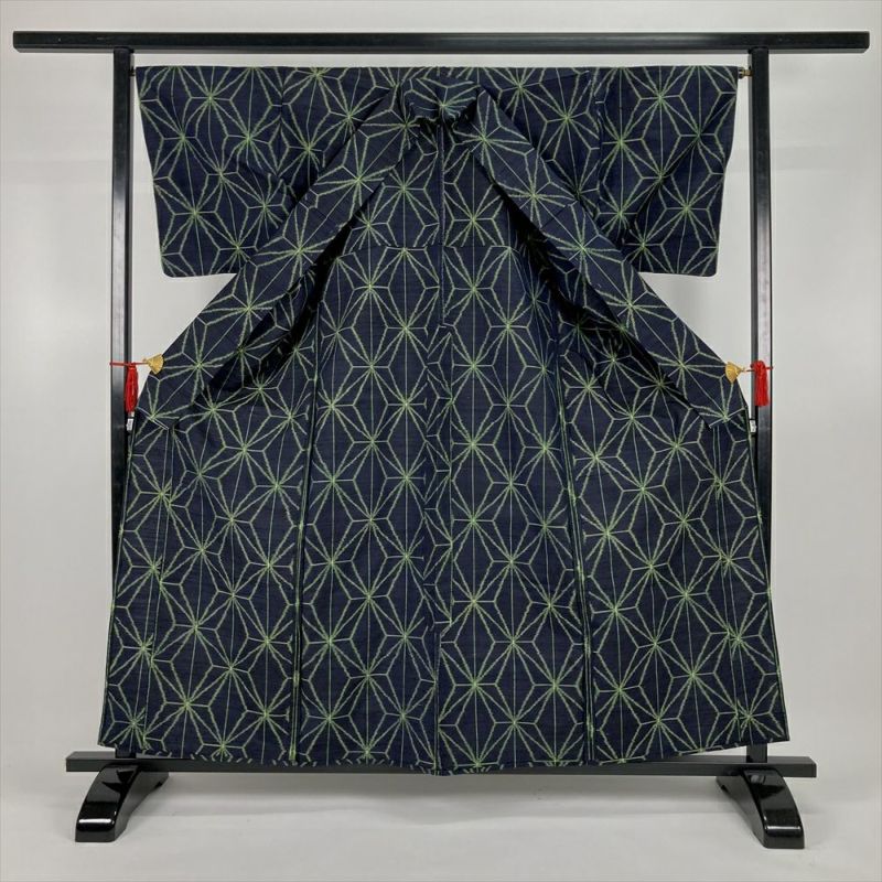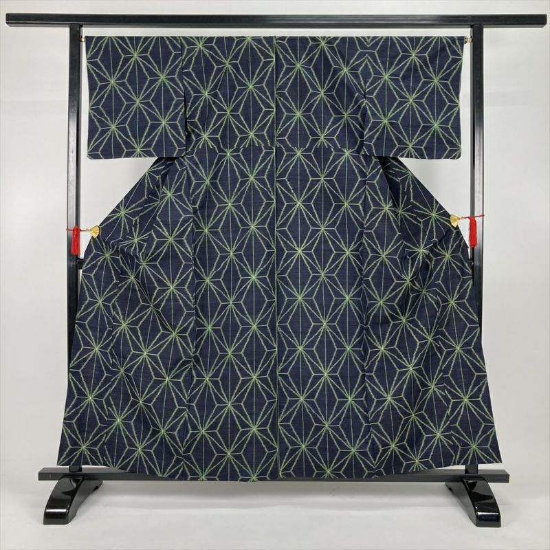 (中古)単衣紬 紺 カジュアル 麻の葉 幾何学模様 ひとえ S【身丈】158cm【裄丈】67cm