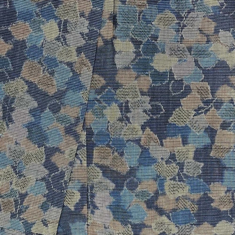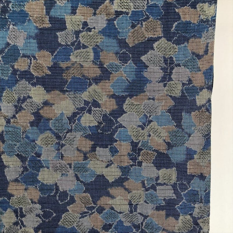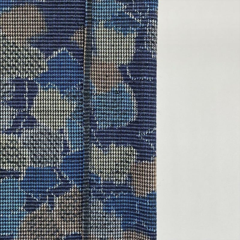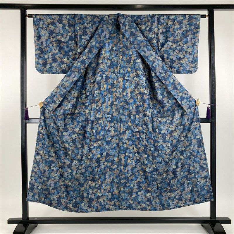 藍色は、古来より日本人が愛してきた伝統色の一つ。深みのある藍色は、心の奥底に静けさをもたらし、落ち着いた雰囲気を醸し出します。木の葉模様は、自然を身近に感じさせてくれる温かみのある柄です。白や薄い色の帯を合わせると、木の葉模様が引き立ちます。濃い色の帯を合わせると、より落ち着いた印象になります。帯揚げや帯締めは、着物と同じ藍色系の色を選ぶとまとまりが生まれます。後ろ身にたたみシワがございます。保存臭がややございます。